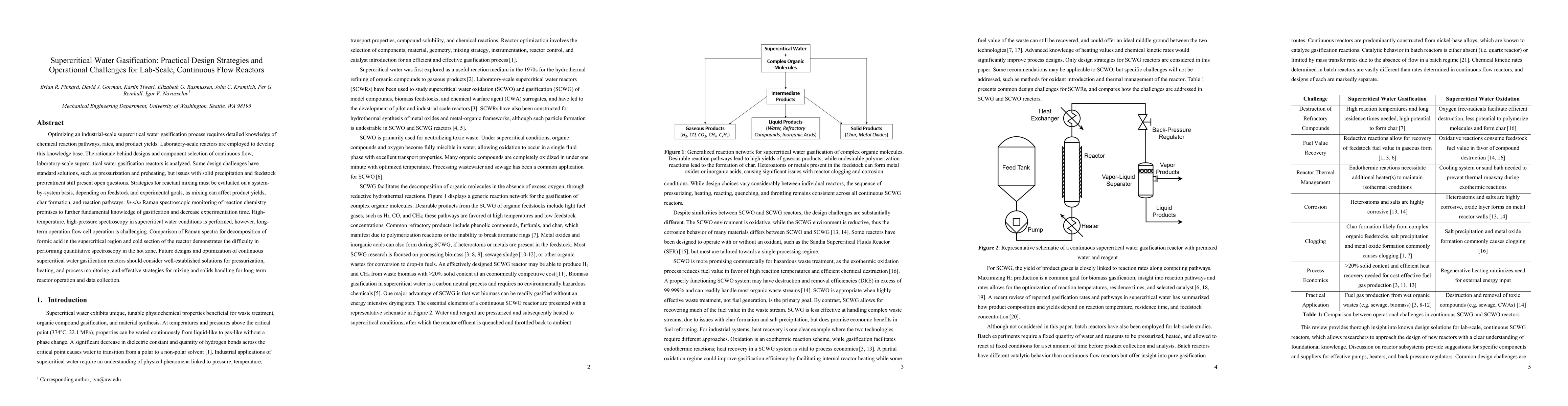 Optimizing an industrial-scale supercritical water gasification process requires detailed knowledge of chemical reaction pathways, rates, and product yields. Laboratory-scale reactors are employed to develop this knowledge base. The rationale behind designs and component selection of continuous flow, laboratory-scale supercritical water gasification reactors is analyzed. Some design challenges have standard solutions, such as pressurization and preheating, but issues with solid precipitation and feedstock pretreatment still present open questions. Strategies for reactant mixing must be evaluated on a system-by-system basis, depending on feedstock and experimental goals, as mixing can affect product yields, char formation, and reaction pathways. In-situ Raman spectroscopic monitoring of reaction chemistry promises to further fundamental knowledge of gasification and decrease experimentation time. High-temperature, high-pressure spectroscopy in supercritical water conditions is performed, however, long-term operation flow cell operation is challenging. Comparison of Raman spectra for decomposition of formic acid in the supercritical region and cold section of the reactor demonstrates the difficulty in performing quantitative spectroscopy in the hot zone. Future designs and optimization of SCWG reactors should consider well-established solutions for pressurization, heating, and process monitoring, and effective strategies for mixing and solids handling for long-term reactor operation and data collection.