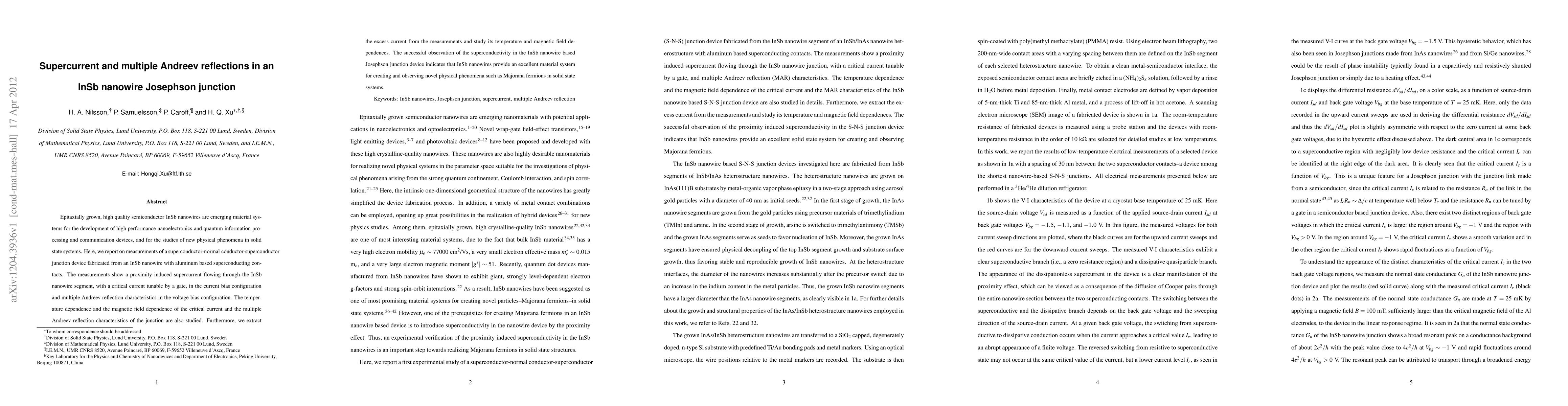 This paper investigates a superconductor-normal conductor-superconductor junction made from an InSb nanowire, showing tunable supercurrent and multiple Andreev reflections, indicating potential for quantum information devices and the study of Majorana fermions. The temperature and magnetic field dependencies of these phenomena are also examined.