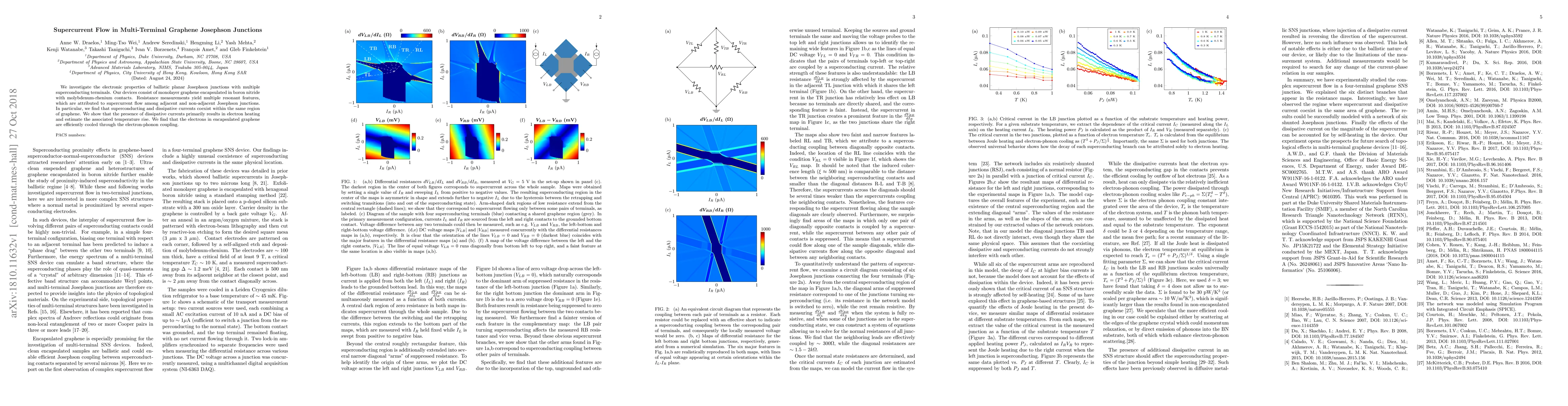 This study explores the electronic properties of graphene-based multi-terminal Josephson junctions, revealing coexistence of superconducting and dissipative currents. The presence of dissipative currents leads to electron heating, which is efficiently mitigated by electron-phonon coupling in the encapsulated graphene.