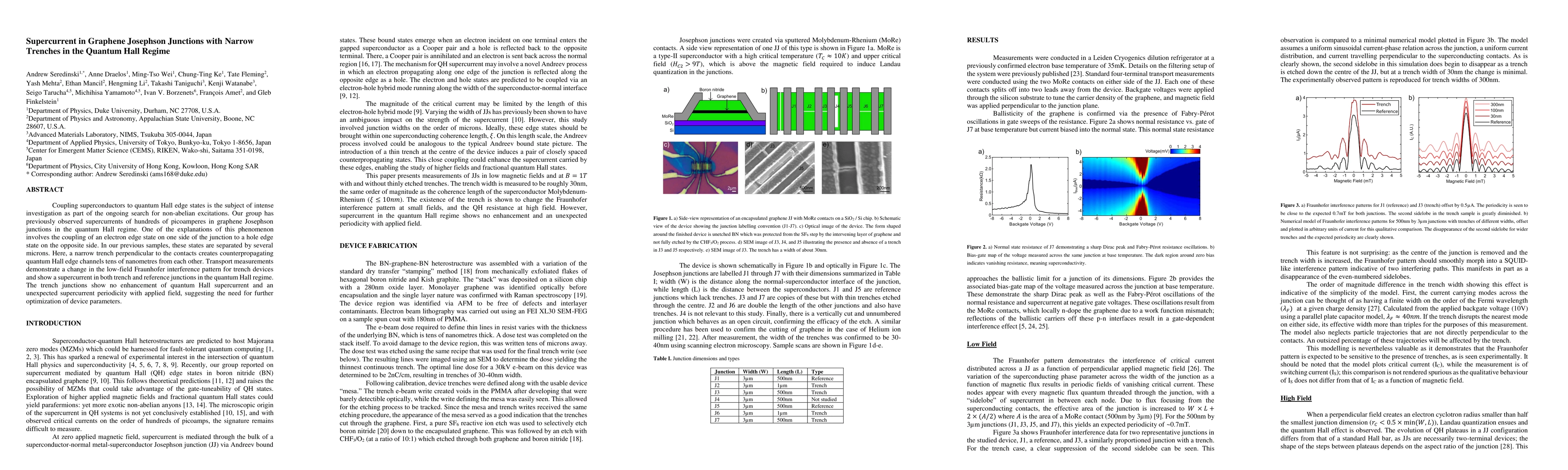 This study investigates supercurrents in graphene Josephson junctions with narrow trenches in the quantum Hall regime, observing a supercurrent despite no enhancement of quantum Hall supercurrent, and a unique supercurrent periodicity with applied field, indicating potential areas for device optimization.