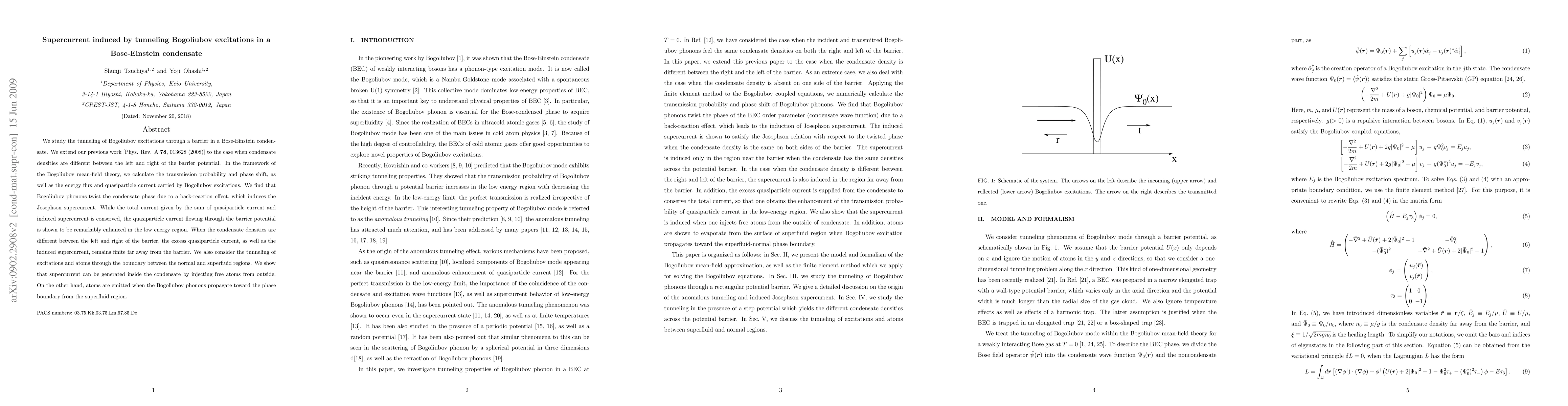 This paper investigates the tunneling of Bogoliubov excitations through a barrier in a Bose-Einstein condensate, finding that Bogoliubov phonons induce a Josephson supercurrent due to phase twisting. The study reveals enhanced quasiparticle current in low energy regions and demonstrates that supercurrent can be generated by injecting free atoms into the condensate.