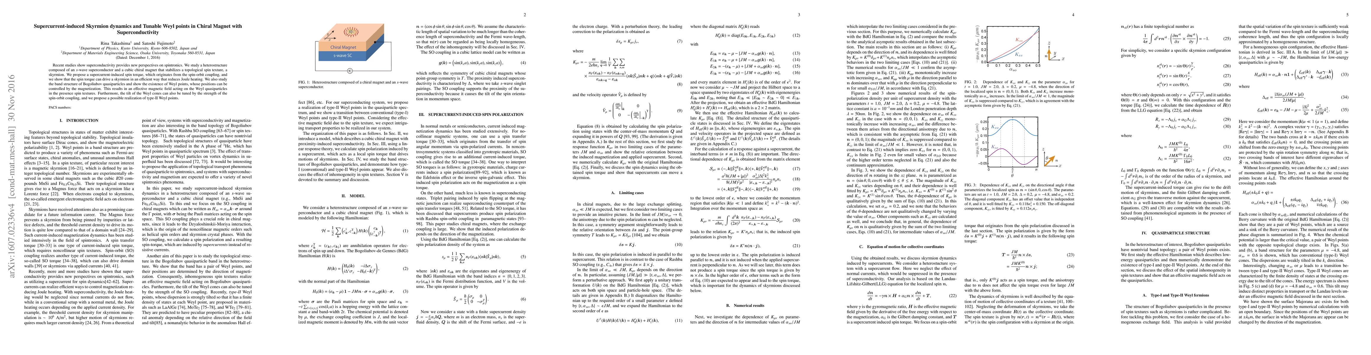 The paper proposes a supercurrent-induced spin torque mechanism to efficiently drive skyrmions in a chiral magnet-superconductor heterostructure, reducing Joule heating. It also reveals tunable Weyl points in the Bogoliubov quasiparticle band structure, controllable by magnetization direction and spin-orbit coupling strength, enabling manipulation of quasiparticle motion in spin textures.