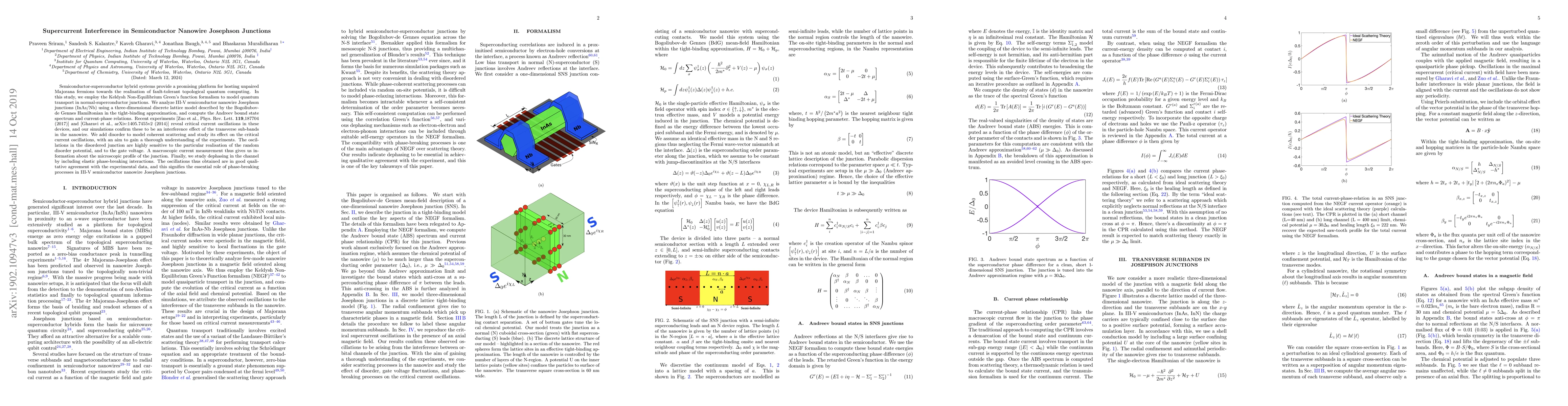 This study models quantum transport in semiconductor-superconductor hybrid systems using the Keldysh formalism, focusing on InAs/Nb nanowire Josephson junctions. The research reveals that critical current oscillations are due to interference effects of transverse sub-bands in the nanowire, and these oscillations are sensitive to disorder and gate voltage, providing insights into the microscopic junction profile.