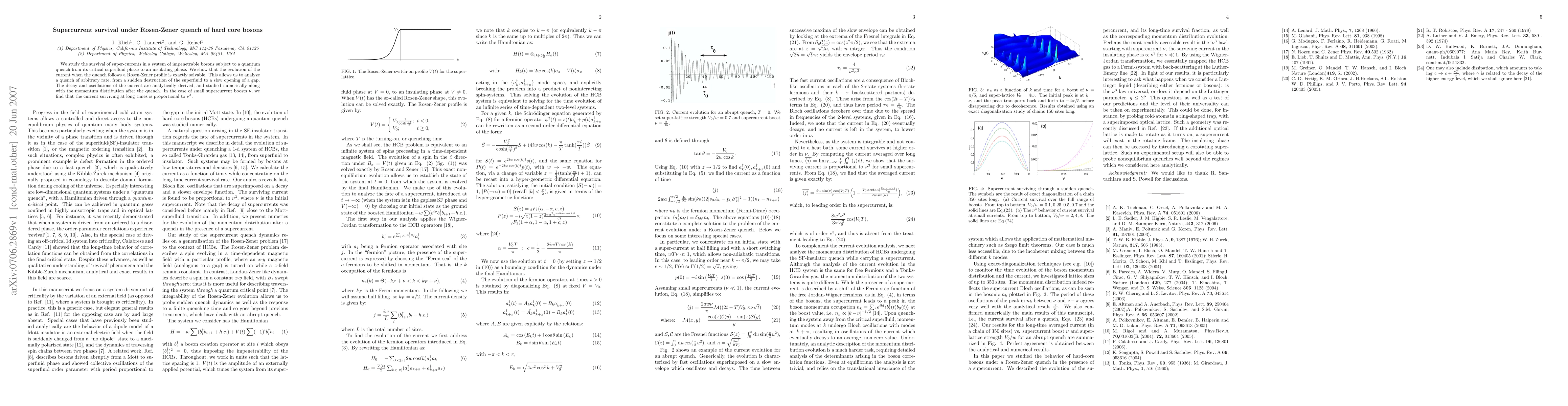 We study the survival of super-currents in a system of impenetrable bosons subject to a quantum quench from its critical superfluid phase to an insulating phase. We show that the evolution of the current when the quench follows a Rosen-Zener profile is exactly solvable. This allows us to analyze a quench of arbitrary rate, from a sudden destruction of the superfluid to a slow opening of a gap. The decay and oscillations of the current are analytically derived, and studied numerically along with the momentum distribution after the quench. In the case of small supercurrent boosts $\nu$, we find that the current surviving at long times is proportional to $\nu^3$.
