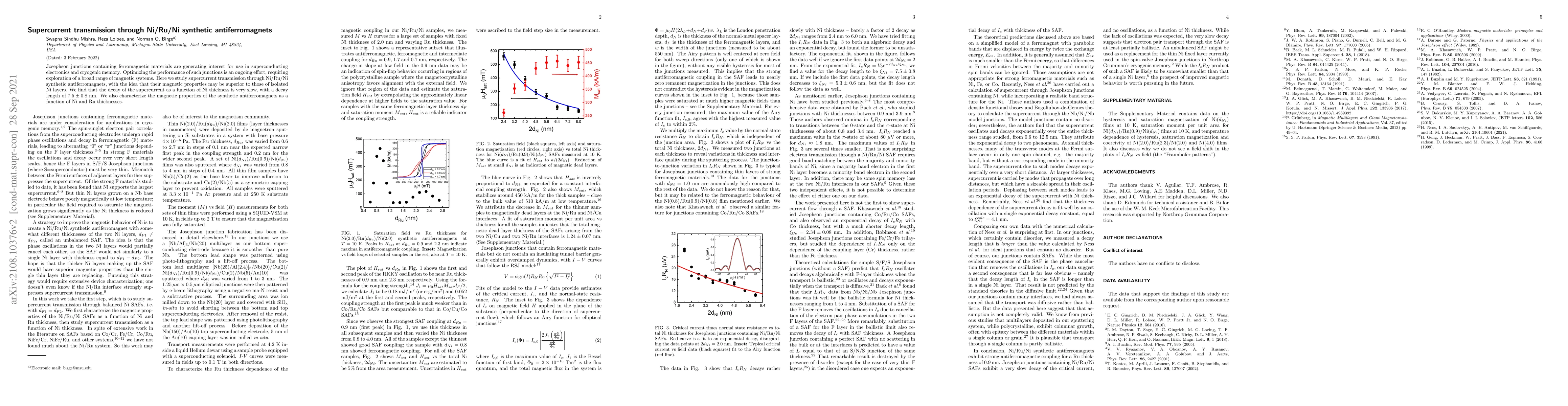 Josephson junctions containing ferromagnetic materials are generating interest for use in superconducting electronics and cryogenic memory. Optimizing the performance of such junctions is an ongoing effort, requiring exploration of a broad range of magnetic systems. Here we study supercurrent transmission through Ni/Ru/Ni synthetic antiferromagnets, with the idea that their magnetic properties may be superior to those of isolated Ni layers. We find that the decay of the supercurrent as a function of Ni thickness is very slow, with a decay length of 7.5 $\pm$ 0.8 nm. We also characterize the magnetic properties of the synthetic antiferromagnets as a function of Ni and Ru thicknesses.
