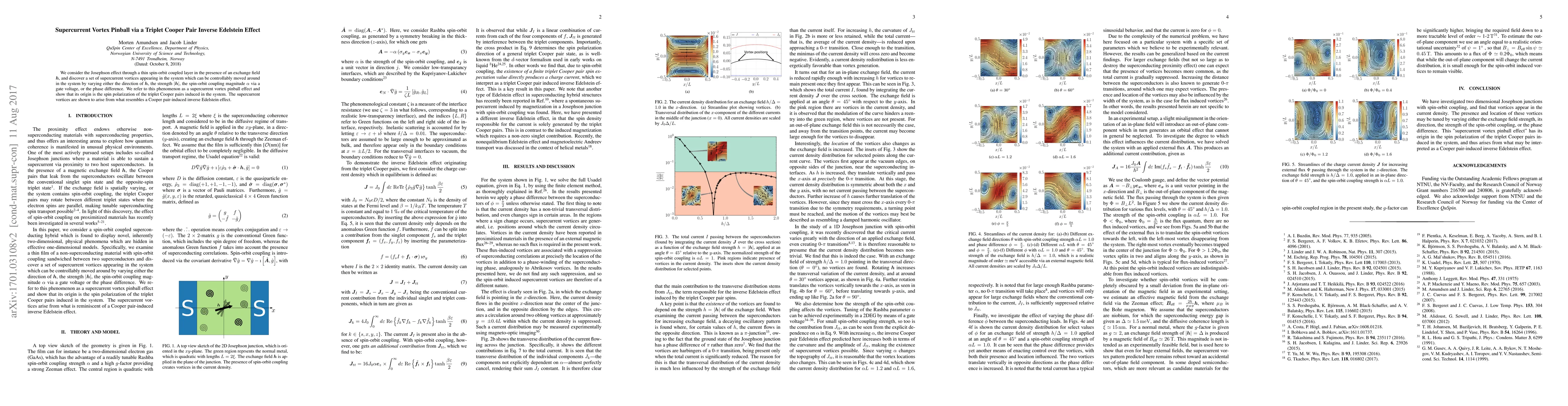 This paper explores the Josephson effect in spin-orbit coupled layers under an exchange field, revealing controllable supercurrent vortices via a triplet Cooper pair-induced inverse Edelstein effect. The study demonstrates the movement of these vortices by manipulating the exchange field or spin-orbit coupling, highlighting the need for higher-dimensional models in superconducting hybrid structures.