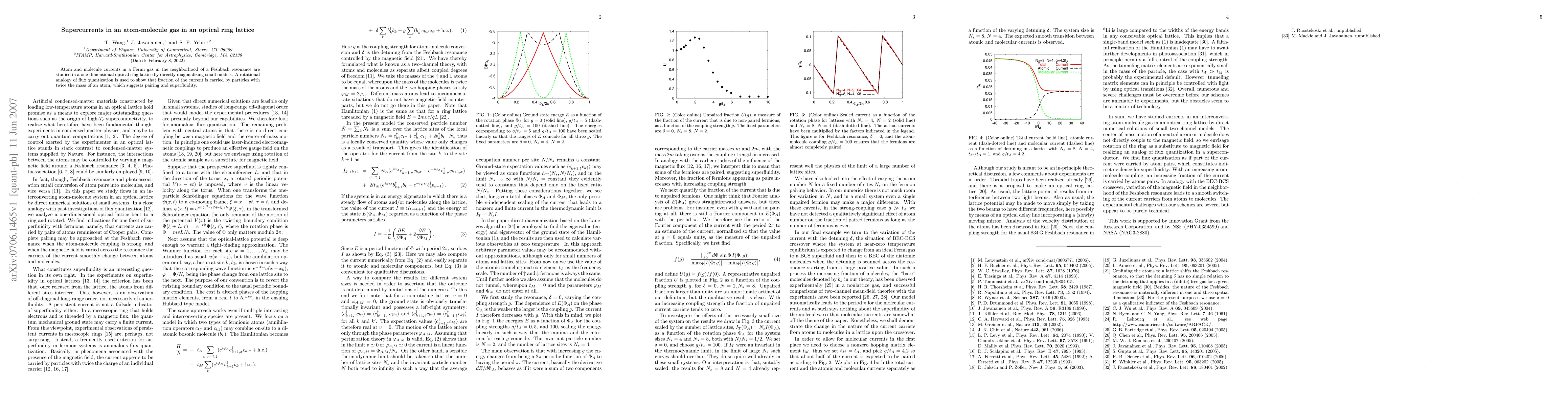 Atom and molecule currents in a Fermi gas in the neighborhood of a Feshbach resonance are studied in a one-dimensional optical ring lattice by directly diagonalizing small models. A rotational analogy of flux quantization is used to show that fraction of the current is carried by particles with twice the mass of an atom, which suggests pairing and superfluidity.