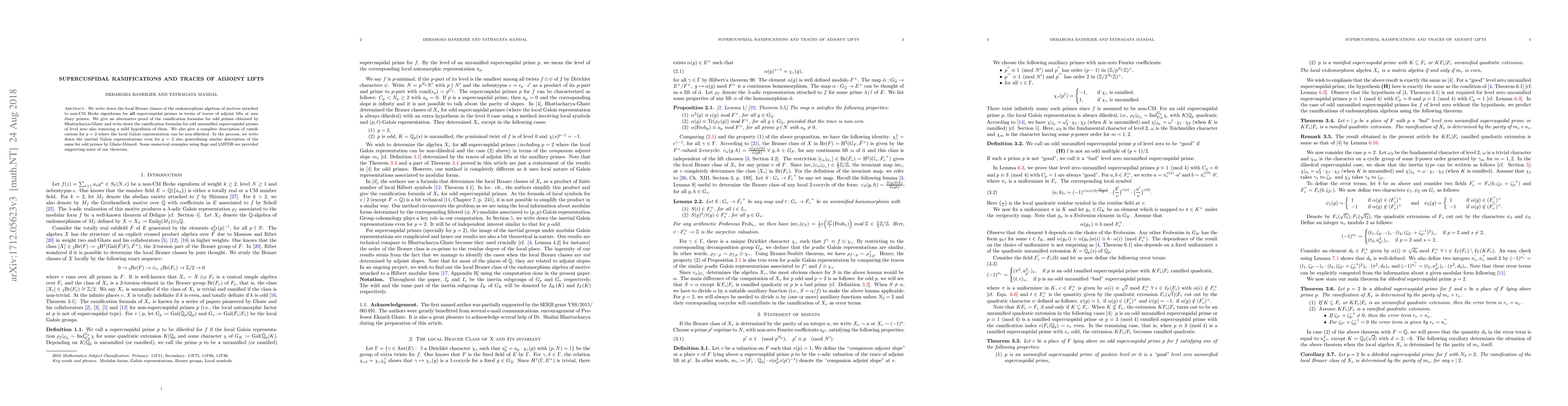 In this paper, we write down the local Brauer classes of the endomorphism algebras of motives attached to non-CM primitive Hecke eigenforms for all supercuspidal primes in terms of traces of adjoint lifts at auxiliary primes. We give an alternative proof of the result for odd primes $p$ obtained in [MR3391026] and write down the ramification formulas for odd unramified supercuspidal primes of level zero also removing a mild hypothesis of [MR3391026]. We also give a complete description of ramifications for $p=2$. The philosophy of adjoint lifts help us to determine the local Brauer classes at non dihedral primes by using results similar to [MR2770587]. We provide some numerical examples using {Sage} and {LMFDB} supporting some of our theorems.
