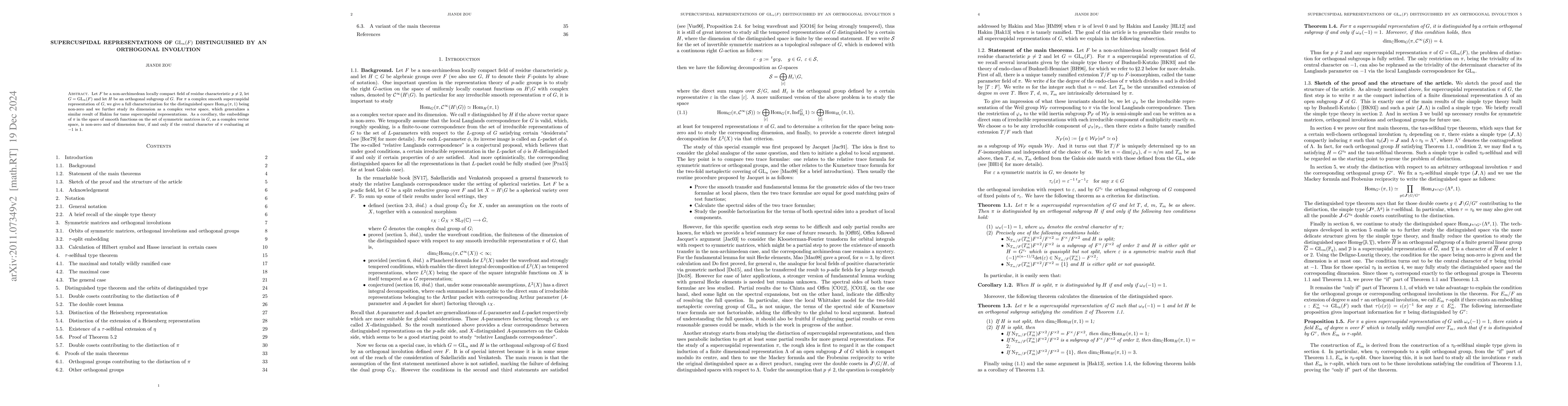 This paper characterizes when complex smooth supercuspidal representations of $\mathrm{GL}_{n}(F)$ have non-zero distinguished spaces under an orthogonal subgroup $H$, generalizing Hakim's result for tame cases. It concludes that the embedding of such representations in smooth functions on symmetric matrices has a non-zero dimension of four if the central character of $\pi$ evaluates to $1$ at $-1$.