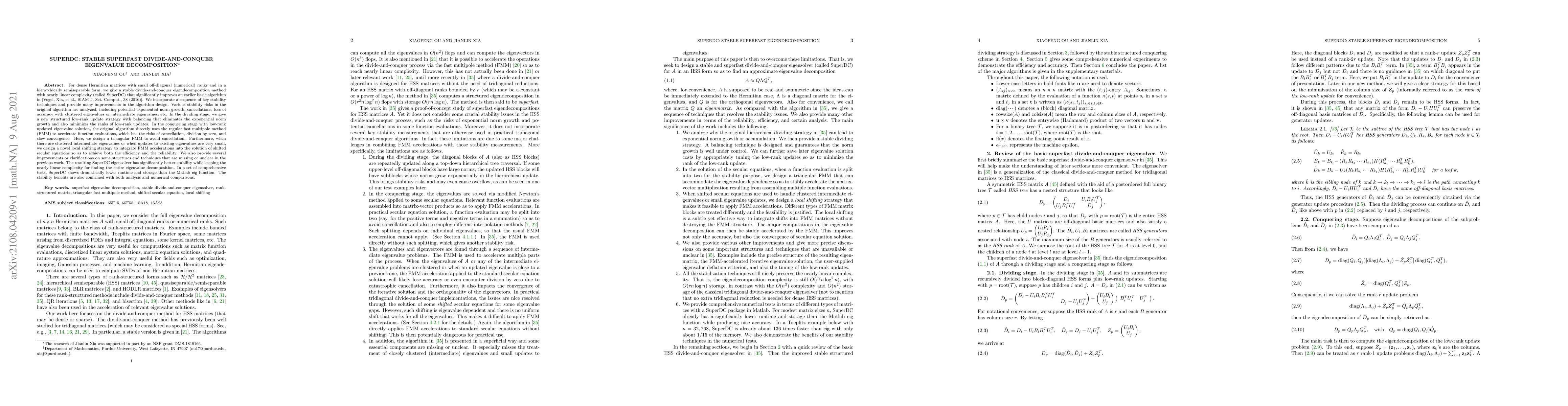 SuperDC presents a stable divide-and-conquer method for eigenvalue decomposition of dense Hermitian matrices, achieving nearly linear complexity and significantly improved stability over previous algorithms. It incorporates advanced techniques to mitigate risks such as exponential norm growth and cancellation, demonstrating lower runtime, storage, and enhanced stability compared to Matlab's $\textsf{eig}$ function.