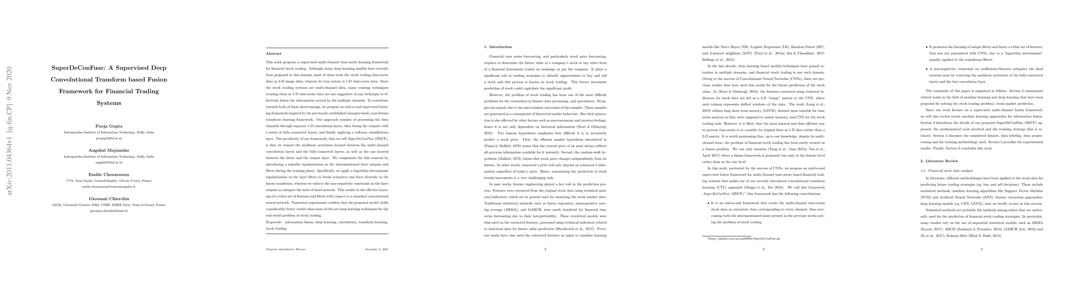 A new deep learning framework, SuperDeConFuse, improves financial trading systems by fusing multiple channel data into a single output, yielding better results than existing techniques.