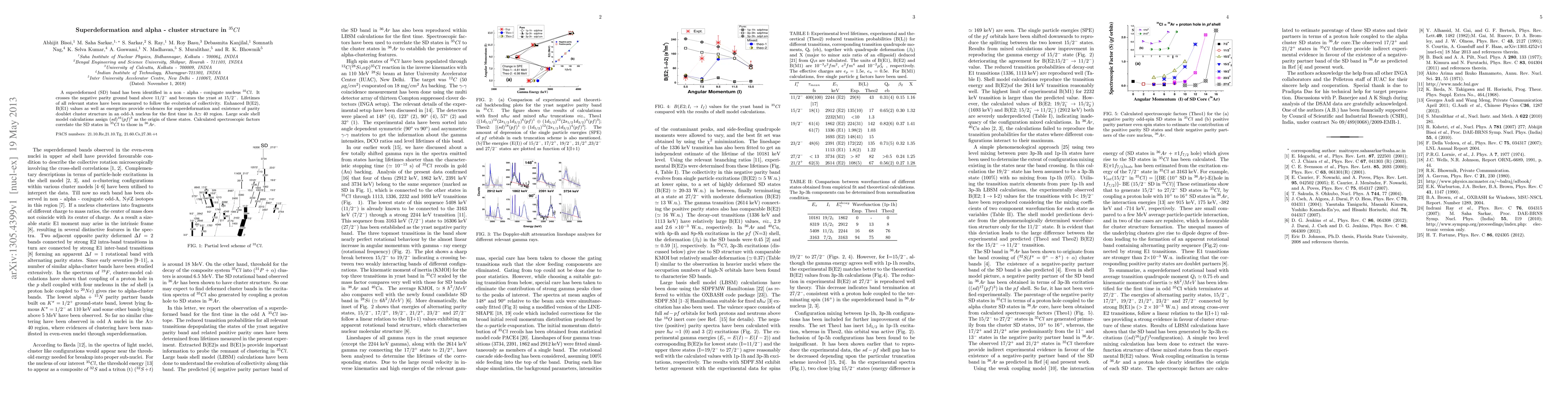 A superdeformed (SD) band has been identified in a non - alpha - conjugate nucleus 35Cl. It crosses the negative parity ground band above 11/2- and becomes the yrast at 15/2-. Lifetimes of all relevant states have been measured to follow the evolution of collectivity. Enhanced B(E2), B(E1) values as well as energetics provide evidences for superdeformation and existence of parity doublet cluster structure in an odd-A nucleus for the first time in A = 40 region. Large scale shell model calculations assign (sd)16(pf)3 as the origin of these states. Calculated spectroscopic factors correlate the SD states in 35Cl to those in 36Ar.