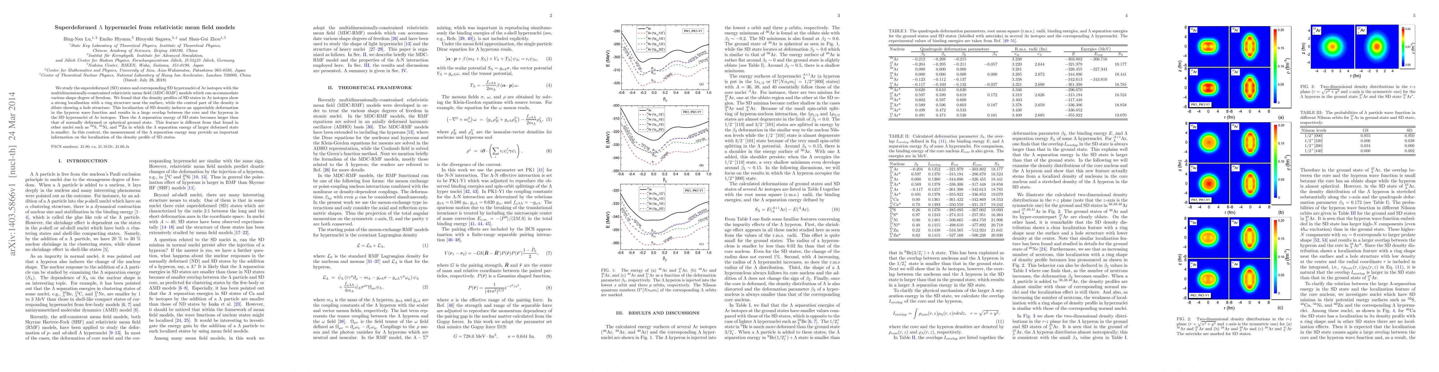 We study the superdeformed (SD) states and corresponding SD hypernuclei of Ar isotopes with the multidimensionally-constrained relativistic mean field (MDC-RMF) models which can accommodate various shape degree of freedom. %The hyperon-nucleon $\sigma$-$\Lambda$ and $\omega$-$\Lambda $ interactions are introduced %in the same covariant framework. We found that the density profiles of SD states in Ar isotopes show a strong localization with a ring structure near the surface, while the central part of the density is dilute showing a hole structure. This localization of SD density induces an appreciable deformation in the hyperon wave function and results in a large overlap between the core and the hyperon in the SD hypernuclei of Ar isotopes. Then the $\Lambda$ separation energy of SD state becomes larger than that of normally deformed or spherical ground state. This feature is different from that found in other nuclei such as $^{32}$S, $^{56}$Ni, and $^{60}$Zn in which the $\Lambda$ separation energy of larger deformed state is smaller. In this context, the measurement of the $\Lambda$ separation energy may provide an important information on the localization of the density profile of SD states.