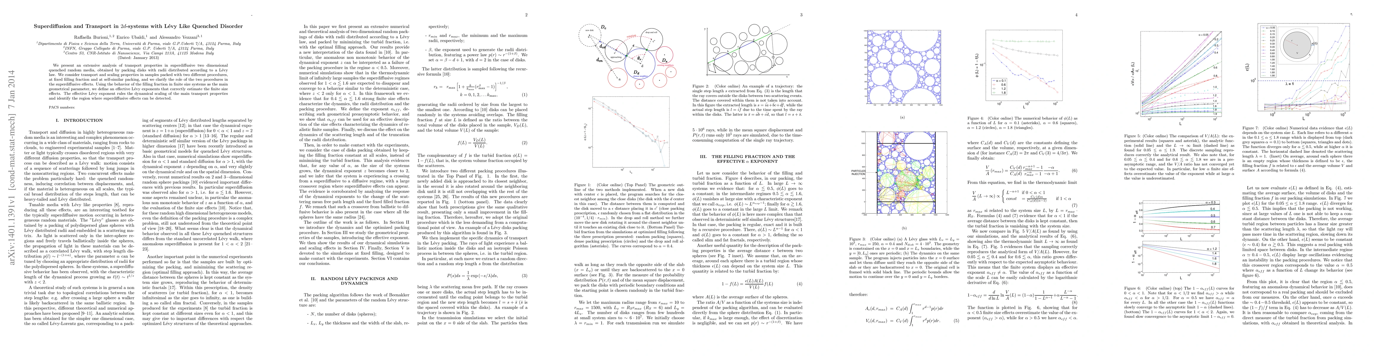 This paper analyzes transport properties in superdiffusive two-dimensional disordered systems created by packing disks with radii following a Lévy distribution. It investigates the impact of different packing procedures on superdiffusive effects and introduces effective Lévy exponents to quantify finite size effects, determining the scaling of transport properties and identifying regions where superdiffusion occurs.