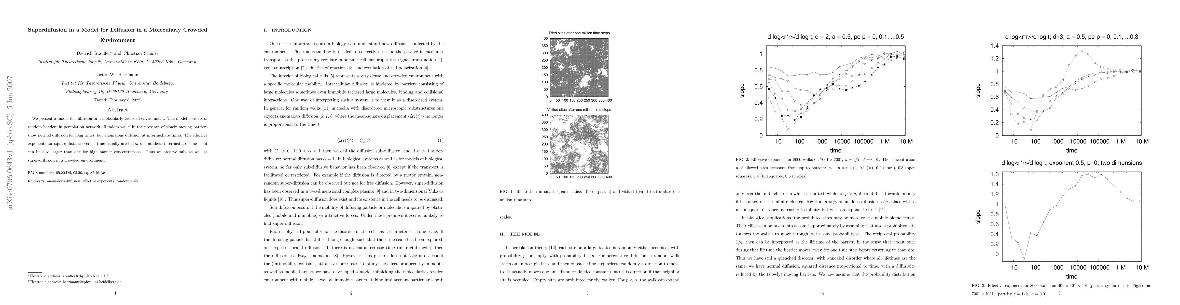 This paper models diffusion in a crowded molecular environment using a percolation network with random barriers, revealing normal diffusion over long times and anomalous diffusion at intermediate times, including both sub-diffusion and super-diffusion depending on barrier concentration.