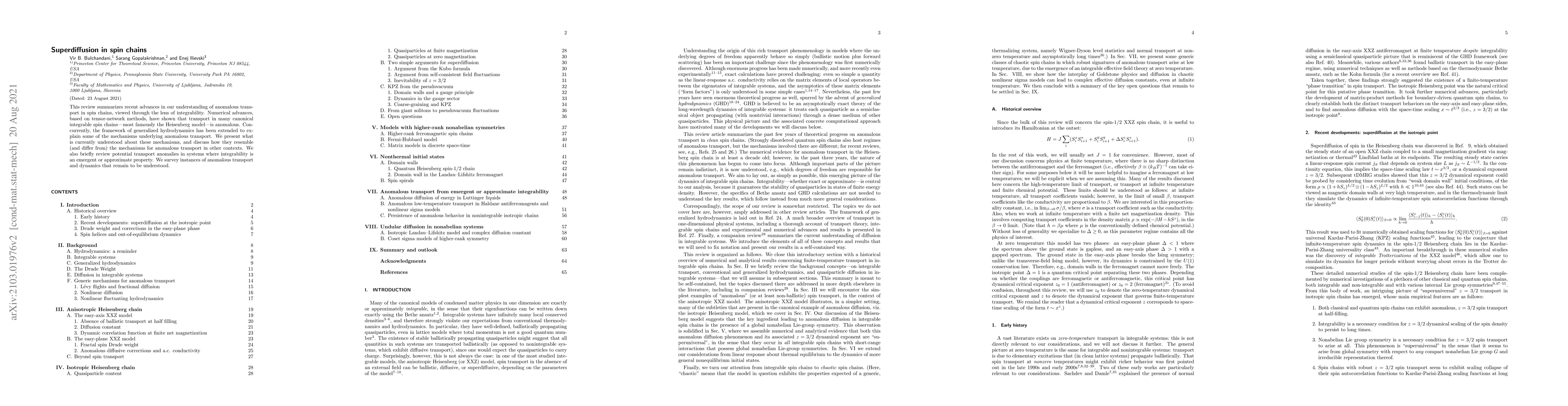 This paper reviews recent advances in understanding anomalous transport in integrable spin chains, emphasizing numerical methods and generalized hydrodynamics, and discusses both exact and approximate integrability scenarios, alongside outstanding questions.