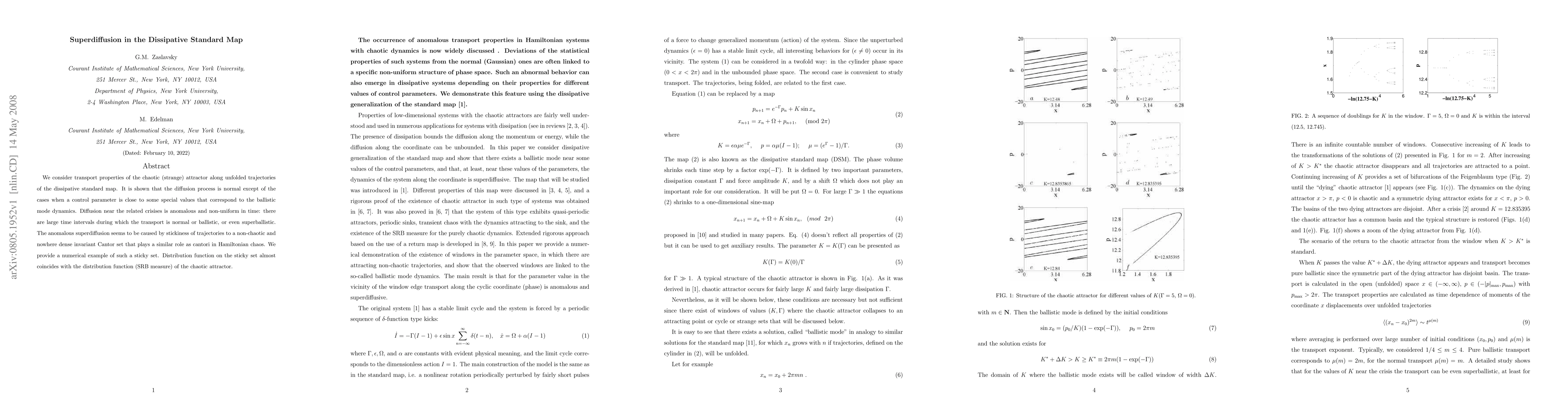 We consider transport properties of the chaotic (strange) attractor along unfolded trajectories of the dissipative standard map. It is shown that the diffusion process is normal except of the cases when a control parameter is close to some special values that correspond to the ballistic mode dynamics. Diffusion near the related crisises is anomalous and non-uniform in time: there are large time intervals during which the transport is normal or ballistic, or even superballistic. The anomalous superdiffusion seems to be caused by stickiness of trajectories to a non-chaotic and nowhere dense invariant Cantor set that plays a similar role as cantori in Hamiltonian chaos. We provide a numerical example of such a sticky set. Distribution function on the sticky set almost coincides with the distribution function (SRB measure) of the chaotic attractor.