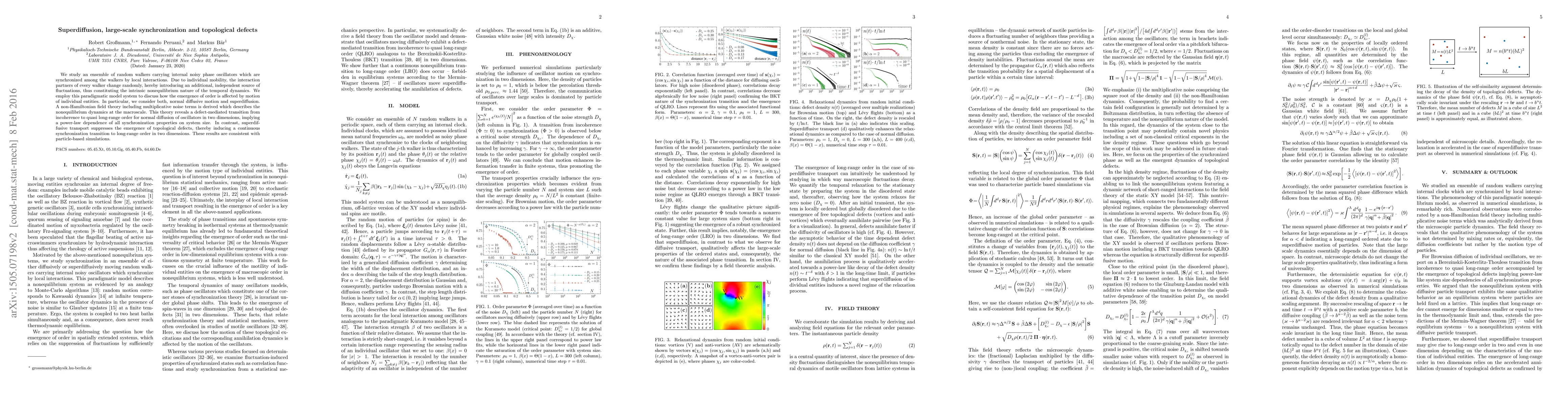 Researchers studied how individual motion affects order in a system of synchronized random walkers with internal oscillators, finding that superdiffusion suppresses topological defects and induces continuous long-range order, while normal diffusion leads to power-law dependence on system size.