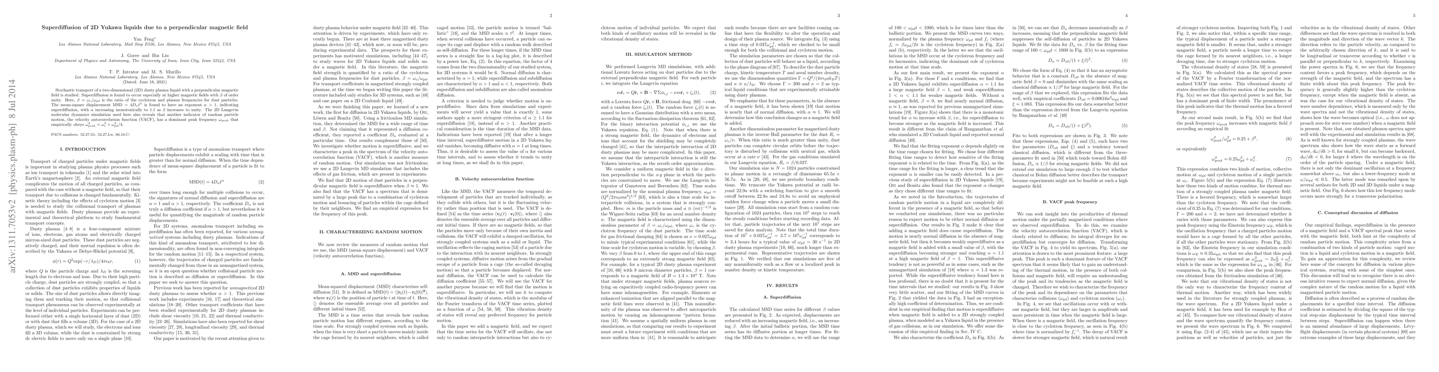 This research investigates the stochastic transport in a 2D dusty plasma liquid under a perpendicular magnetic field, revealing superdiffusion characterized by an exponent $\alpha > 1$ in the mean-square displacement. The study shows that superdiffusion intensifies with increasing magnetic field strength, as indicated by the VACF's peak frequency relation.