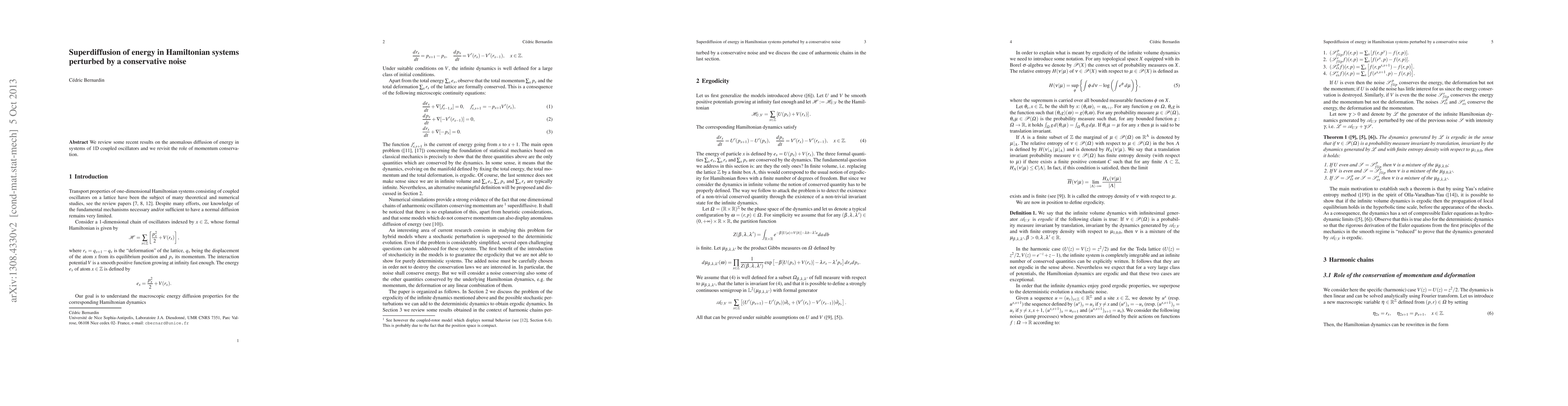We review some recent results on the anomalous diffusion of energy in systems of 1D coupled oscillators and we revisit the role of momentum conservation.