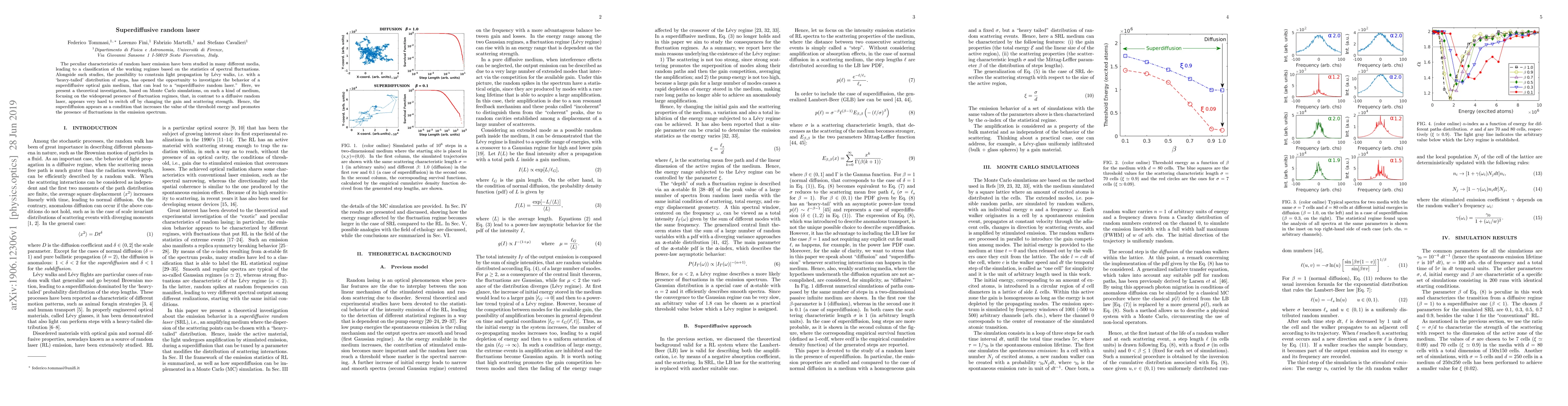 This paper investigates the theoretical behavior of a superdiffusive random laser using Monte Carlo simulations, revealing that superdiffusion increases the threshold energy and enhances fluctuations in the emission spectrum, making it difficult to switch off despite changes in gain and scattering strength.
