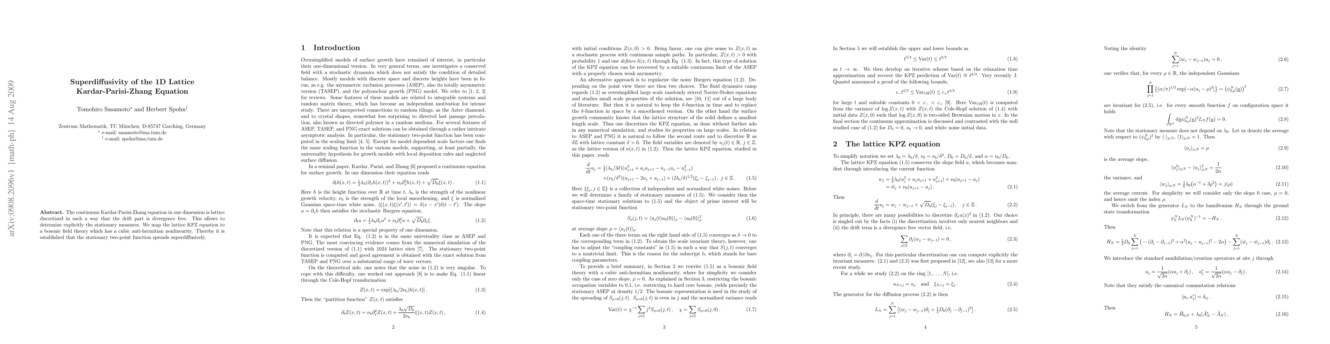This paper investigates the lattice version of the 1D Kardar-Parisi-Zhang equation, showing that it can be mapped to a bosonic field theory with a cubic anti-Hermitian nonlinearity, leading to superdiffusive spreading of the stationary two-point function.
