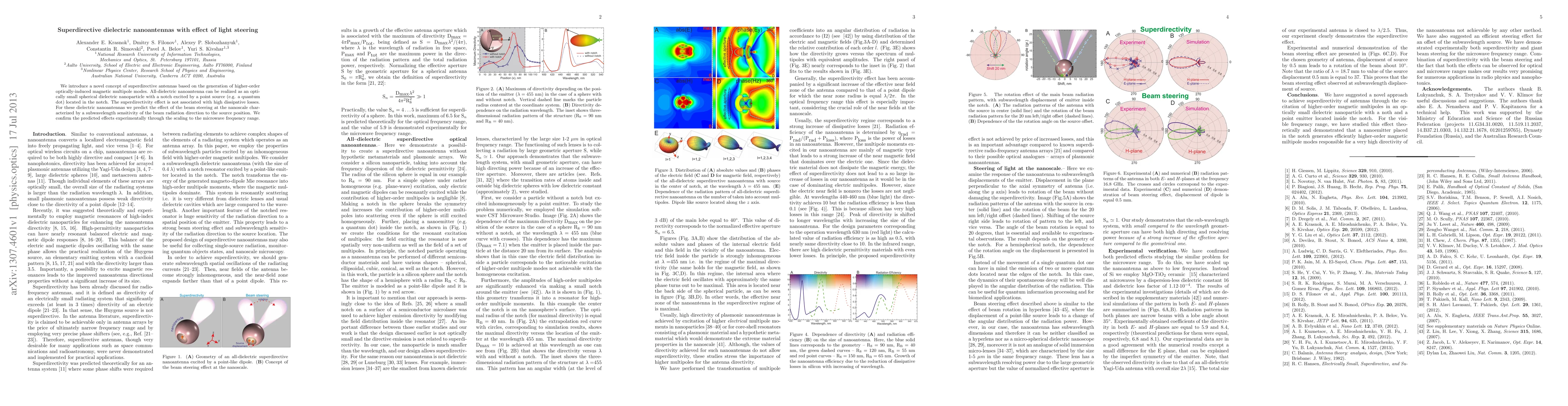 This paper proposes superdirective dielectric nanoantennas that utilize higher-order magnetic multipole modes for enhanced directivity without high dissipative losses, demonstrating nanoscale beam steering and validating the concept experimentally at microwave frequencies.