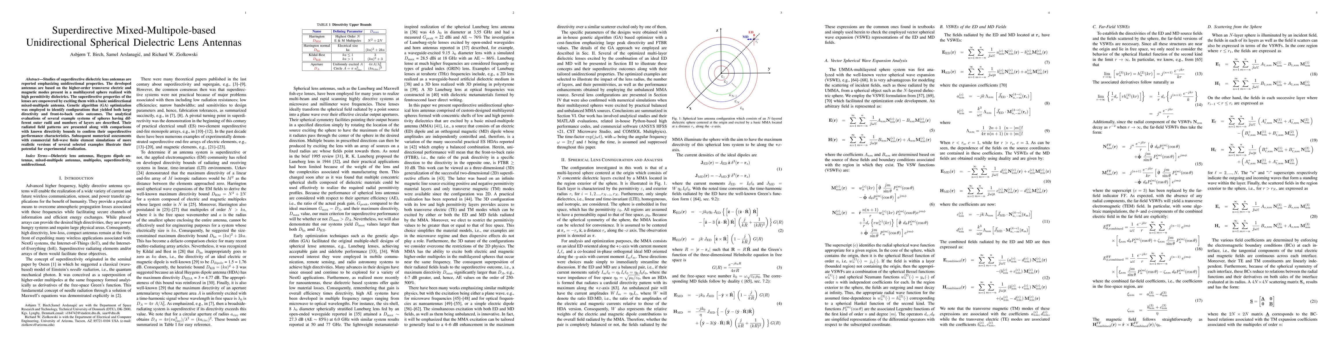 The paper introduces a mixed-multipole-based superdirective lens antenna design approach, combining higher-order modes in multilayered spheres with genetic algorithm optimization for unidirectional radiation patterns.
