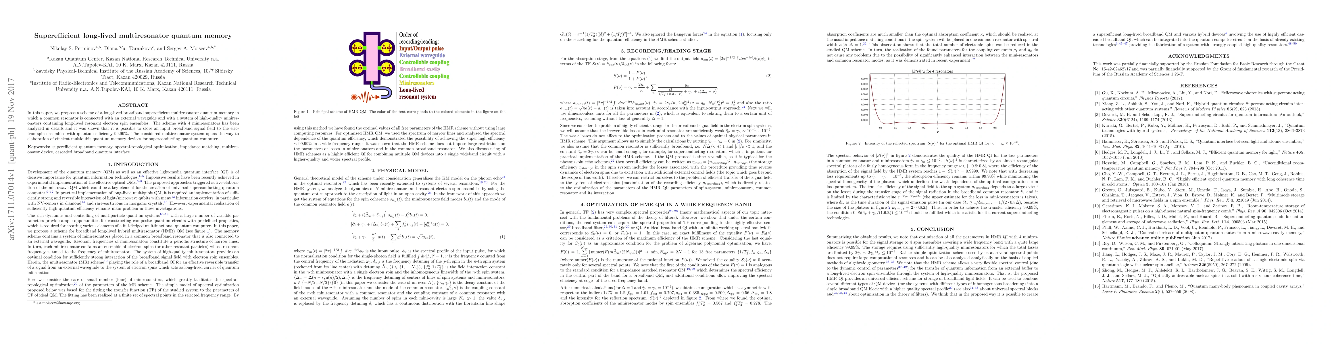 This paper proposes a long-lived, superefficient multiresonator quantum memory scheme that utilizes high-quality miniresonators with long-lived electron spin ensembles, achieving a quantum efficiency of 99.99% for storing broadband signals. The design paves the way for developing efficient multiqubit quantum memory devices for superconducting quantum computers.
