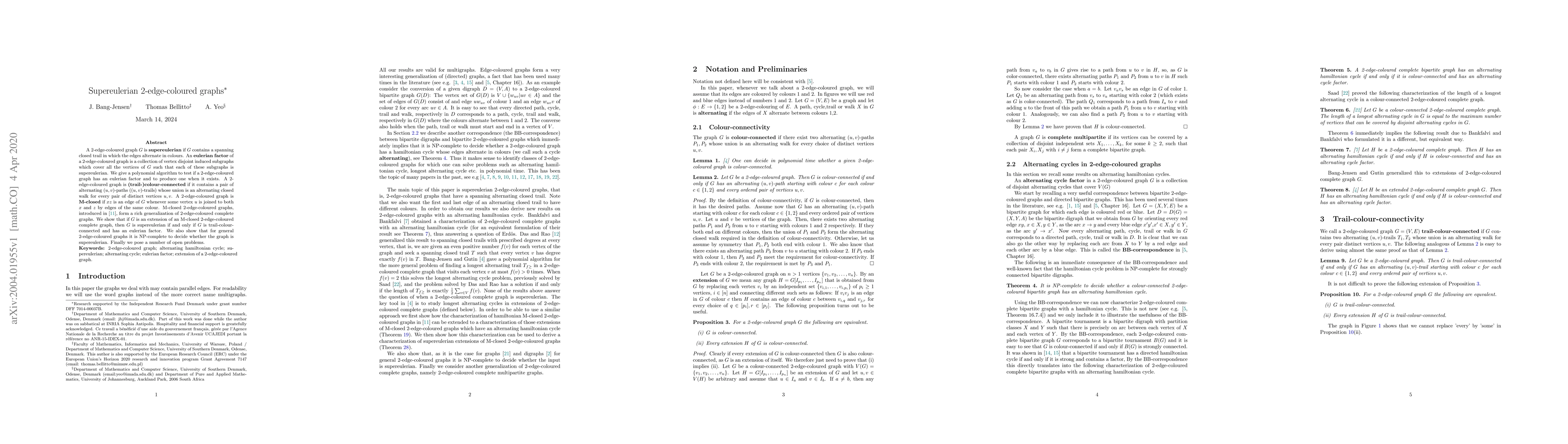 This paper presents a polynomial algorithm to determine if a 2-edge-coloured graph has an eulerian factor and is supereulerian, and explores the properties of trail-colour-connected and M-closed graphs. It concludes that extending M-closed complete graphs results in supereulerian graphs if and only if they are trail-colour-connected and possess an eulerian factor.