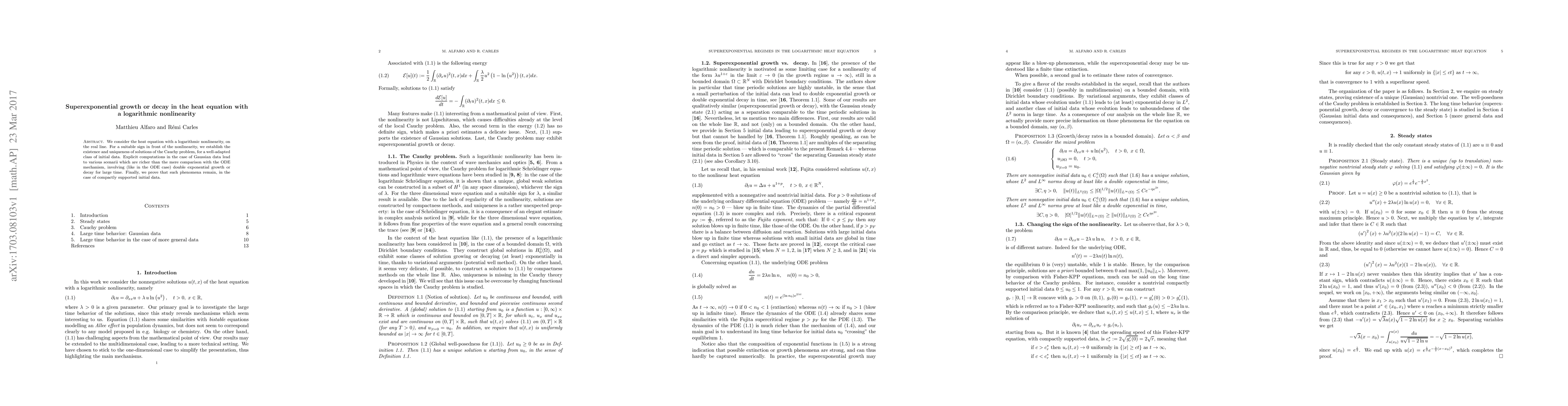 This paper investigates the heat equation with a logarithmic nonlinearity on the real line, establishing the existence and uniqueness of solutions for specific initial data. It reveals superexponential growth or decay phenomena, richer than simple ODE comparisons, even for compactly supported initial data.