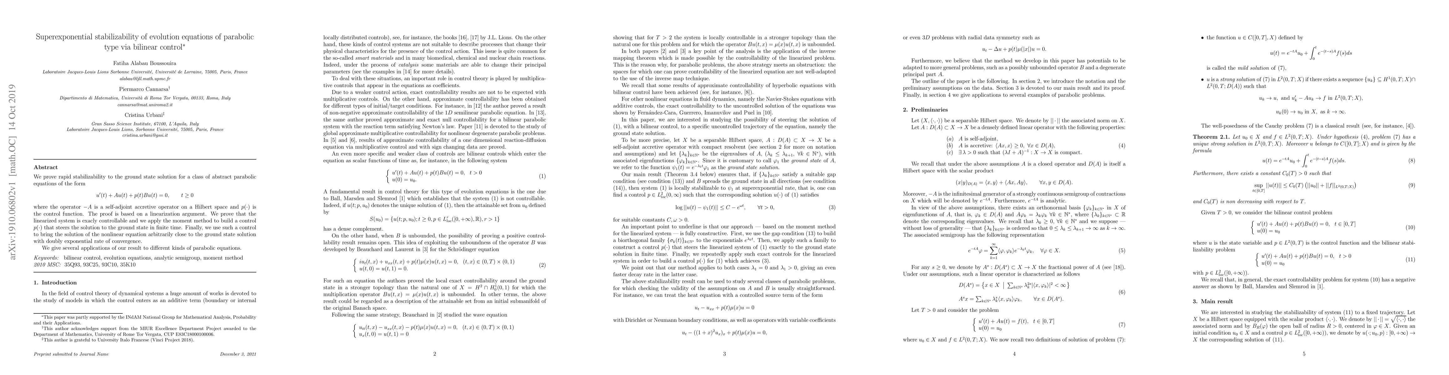 We prove rapid stabilizability to the ground state solution for a class of abstract parabolic equations of the form \begin{equation*} u'(t)+Au(t)+p(t)Bu(t)=0,\qquad t\geq0 \end{equation*} where the operator $-A$ is a self-adjoint accretive operator on a Hilbert space and $p(\cdot)$ is the control function. The proof is based on a linearization argument. We prove that the linearized system is exacly controllable and we apply the moment method to build a control $p(\cdot)$ that steers the solution to the ground state in finite time. Finally, we use such a control to bring the solution of the nonlinear equation arbitrarily close to the ground state solution with doubly exponential rate of convergence. We give several applications of our result to different kinds of parabolic equations.