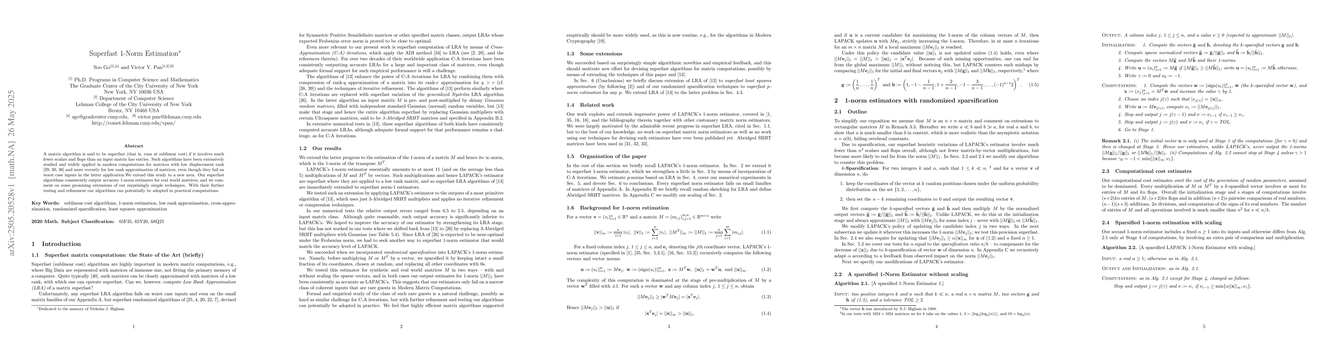 Novel superfast matrix algorithms for consistent and accurate 1-norm estimation.