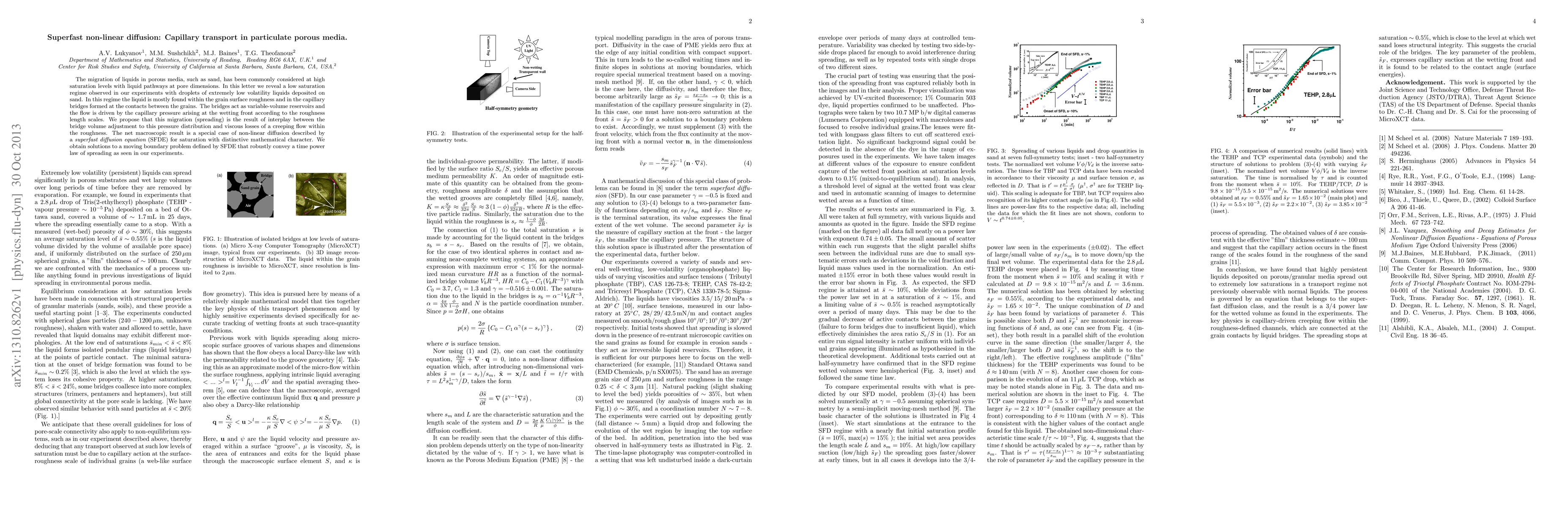 This paper investigates the migration of low volatility liquids in porous media under low saturation conditions, revealing a superfast non-linear diffusion mechanism driven by capillary pressure in grain surface roughness and capillary bridges. The findings are modeled by a superfast diffusion equation (SFDE) that describes a time power law of spreading observed experimentally.