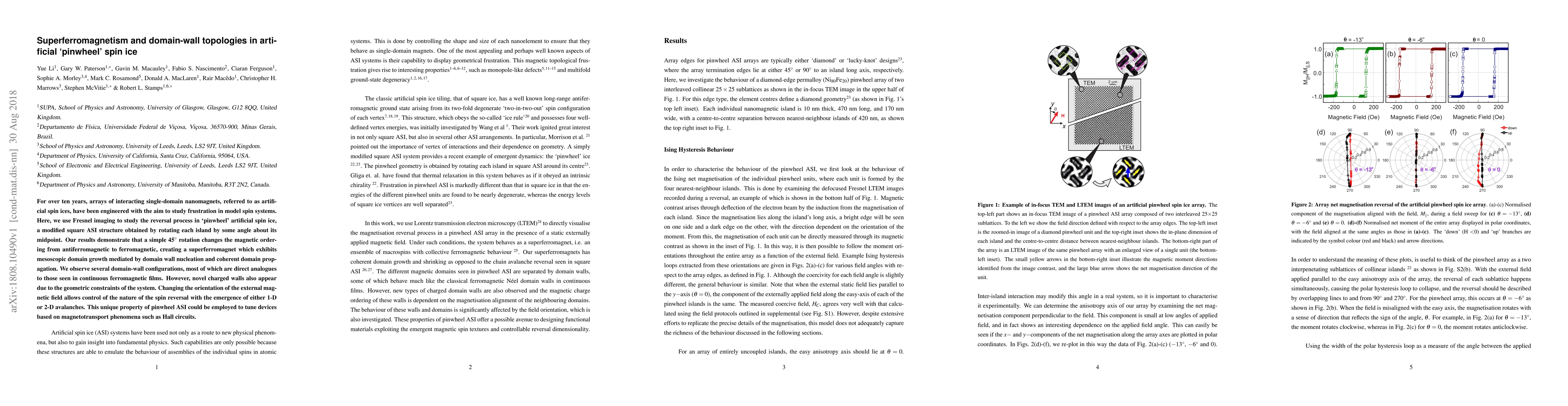 This paper investigates the magnetic ordering in 'pinwheel' artificial spin ice, revealing that a 45° rotation transforms it into a superferromagnet with mesoscopic domain growth and unique domain-wall configurations. The study demonstrates the potential for controlling spin reversal through external magnetic field orientation, suggesting applications in magnetotransport devices.