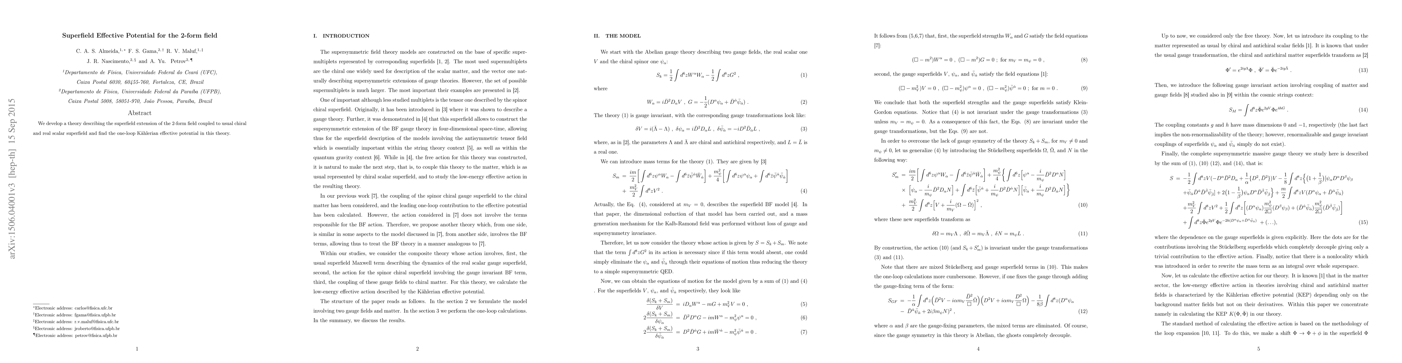 This paper develops a theory for the superfield extension of the 2-form field coupled with chiral and real scalar superfields, and computes the one-loop Kählerian effective potential within this framework.