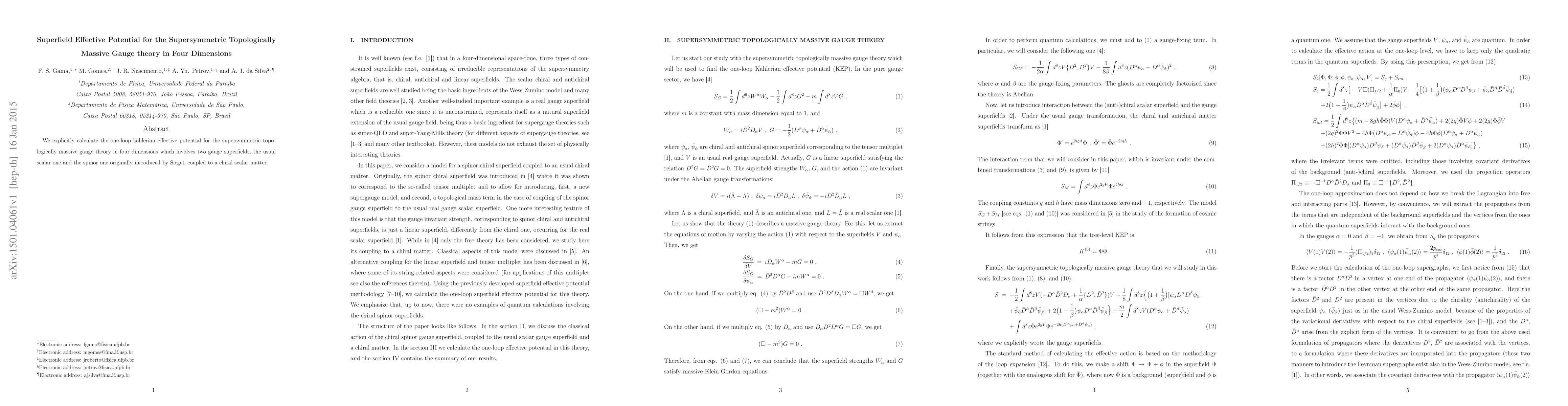 Summary: This paper calculates the one-loop effective potential for a supersymmetric topologically massive gauge theory in four dimensions, focusing on the interaction between a chiral scalar superfield and the gauge spinor superfield's field strength. The study provides insights into the dynamics of such supersymmetric systems.