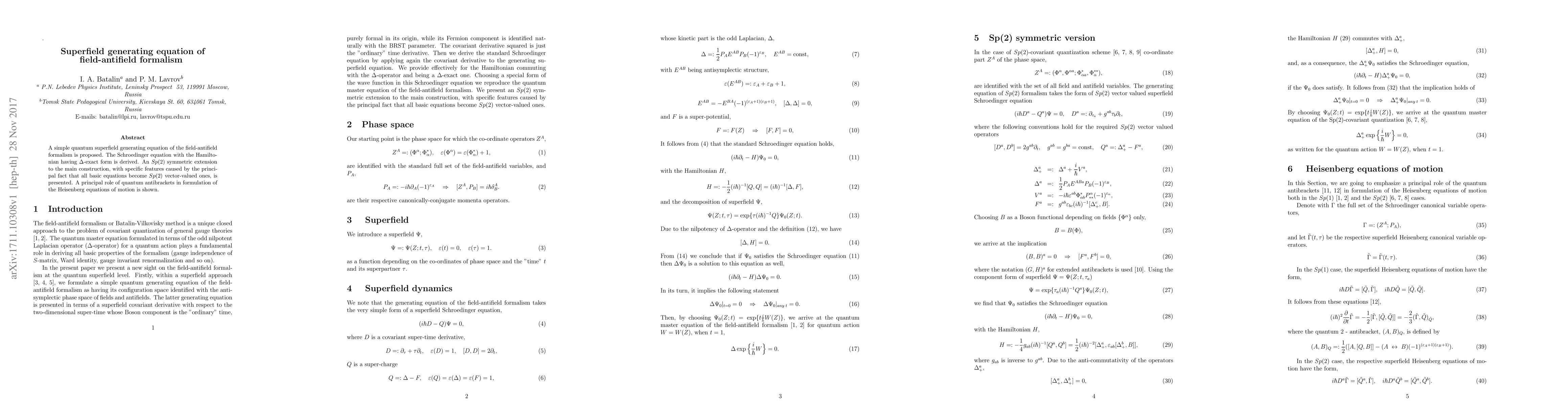 A simple quantum superfield generating equation of the field-antifield formalism is proposed. The Schroedinger equation with the Hamiltonian having $\Delta$-exact form is derived. An $Sp(2)$ symmetric extension to the main construction, with specific features caused by the principal fact that all basic equations become $Sp(2)$ vector-valued ones, is presented. A principal role of quantum antibrackets in formulation of the Heisenberg equations of motion is shown.