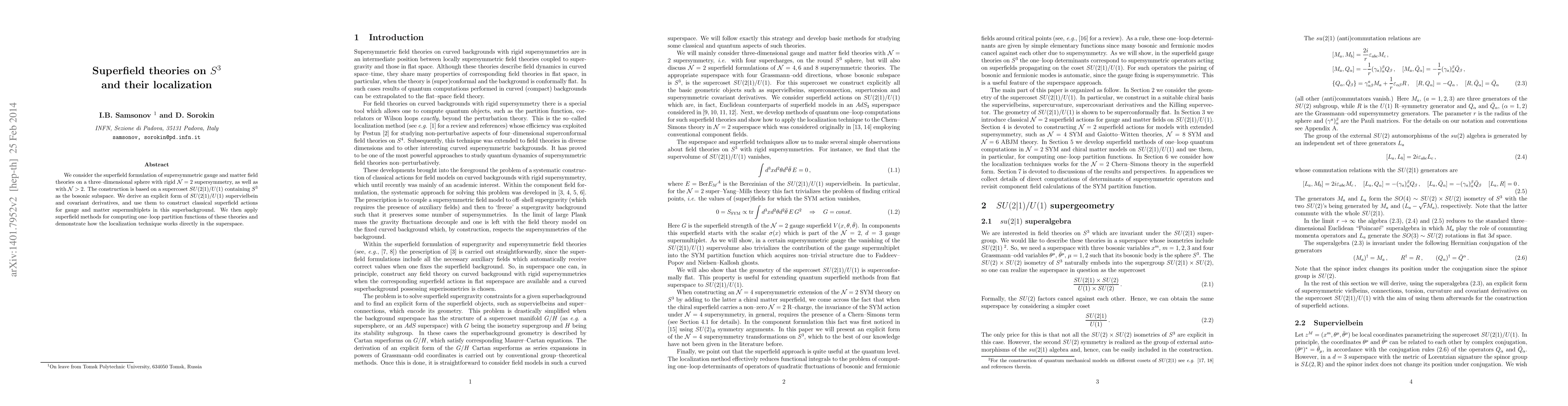 This paper constructs superfield formulations for ${\cal N}=2$ and higher supersymmetric gauge and matter theories on $S^3$, utilizing a supercoset $SU(2|1)/U(1)$ and deriving explicit supervielbein and covariant derivatives. It applies localization techniques to compute one-loop partition functions in this superspace framework.