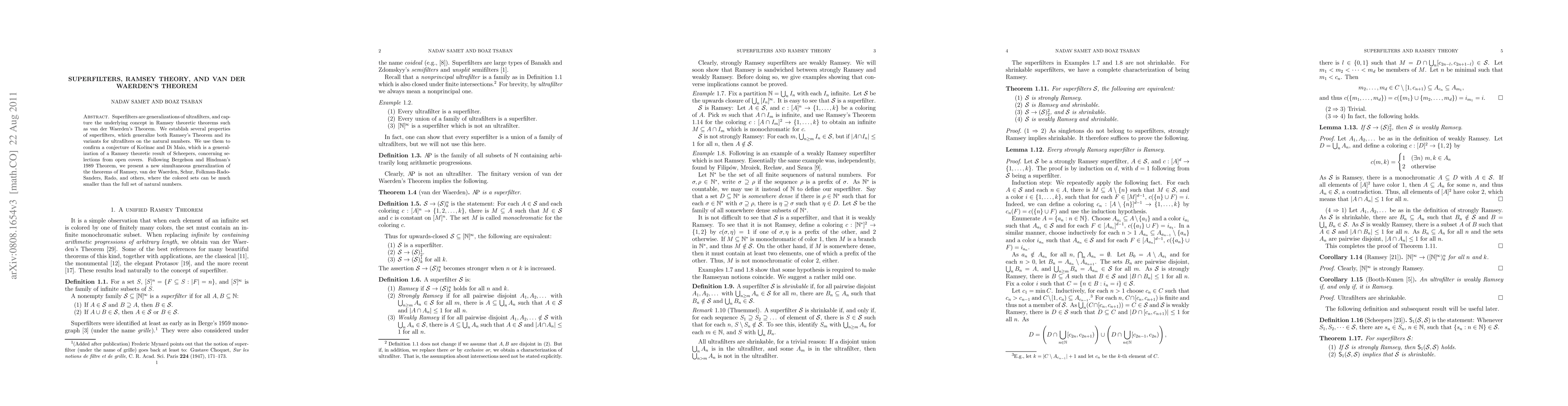 This paper investigates superfilters, a generalization of ultrafilters, to explore their applications in Ramsey theory and to prove a conjecture concerning selections from open covers. It also extends several classical theorems, including van der Waerden's Theorem, by allowing colored sets to be smaller than the natural numbers.