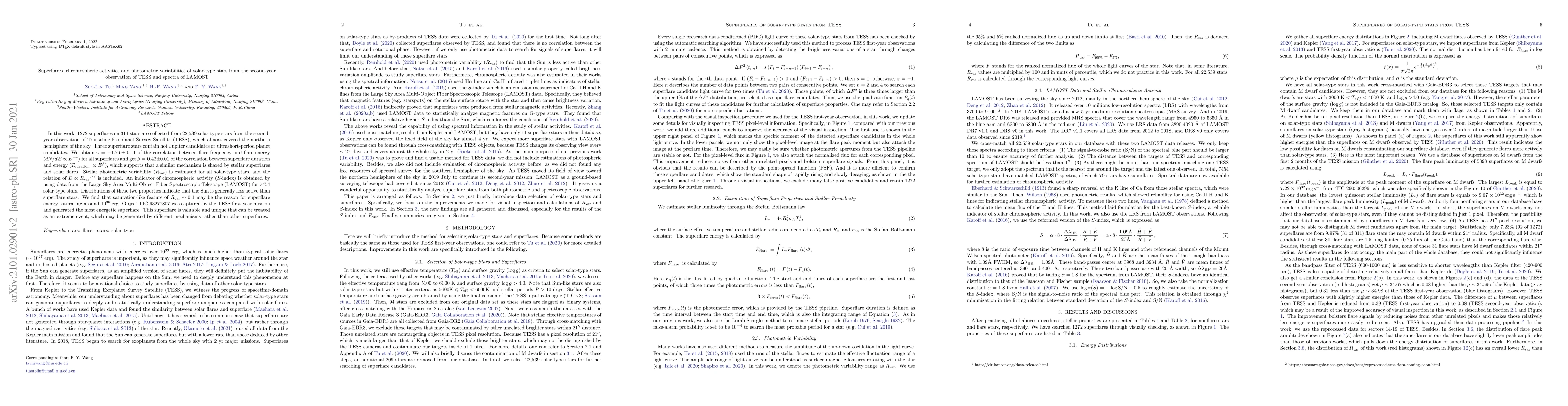 In this work, 1272 superflares on 311 stars are collected from 22,539 solar-type stars from the second-year observation of Transiting Exoplanet Survey Satellite (TESS), which almost covered the northern hemisphere of the sky. Three superflare stars contain hot Jupiter candidates or ultrashort-period planet candidates. We obtain $\gamma = -1.76\pm 0.11$ of the correlation between flare frequency and flare energy ($dN/dE\propto E^{-\gamma}$) for all superflares and get $\beta=0.42\pm0.01$ of the correlation between superflare duration and energy ($T_{\text {duration }} \propto E^{\beta}$), which supports that a similar mechanism is shared by stellar superflares and solar flares. Stellar photometric variability ($R_{\rm var}$) is estimated for all solar-type stars, and the relation of $E\propto {R_{\rm var}}^{3/2}$ is included. An indicator of chromospheric activity ($S$-index) is obtained by using data from the Large Sky Area Multi-Object Fiber Spectroscopic Telescope (LAMOST) for 7454 solar-type stars. Distributions of these two properties indicate that the Sun is generally less active than superflare stars. We find that saturation-like feature of $R_{\rm var}\sim 0.1$ may be the reason for superflare energy saturating around $10^{36}$ erg. Object TIC 93277807 was captured by the TESS first-year mission and generated the most energetic superflare. This superflare is valuable and unique that can be treated as an extreme event, which may be generated by different mechanisms rather than other superflares.