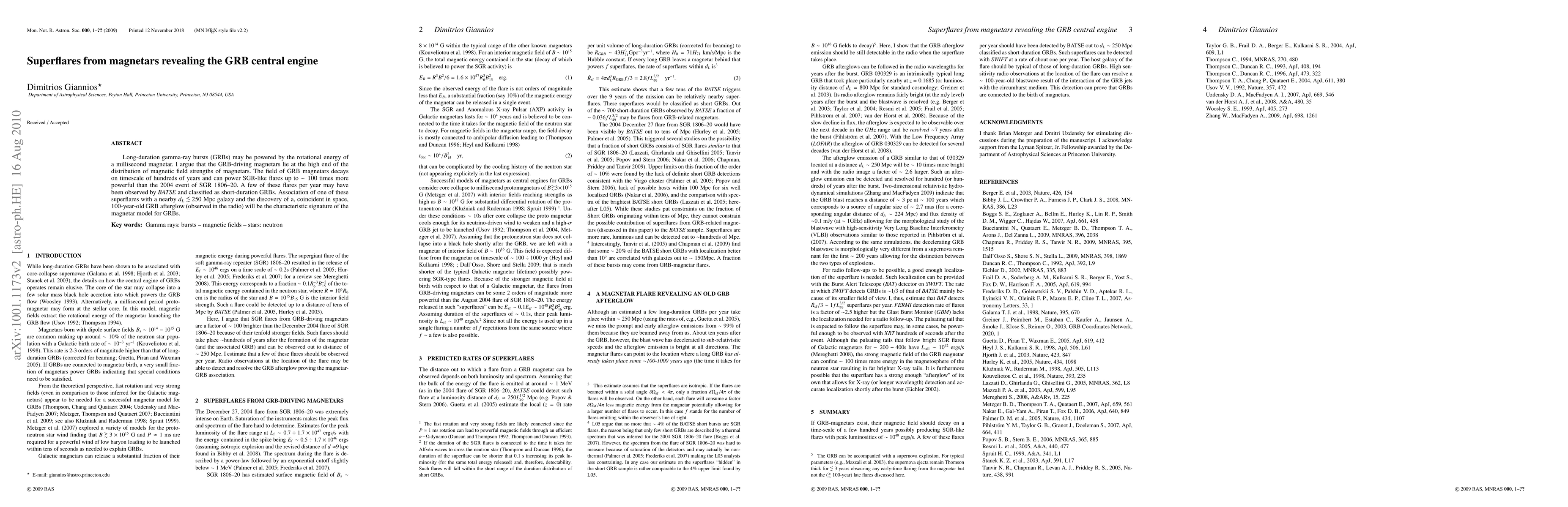 Long-duration gamma-ray bursts (GRBs) may be powered by the rotational energy of a millisecond magnetar. I argue that the GRB-driving magnetars lie at the high end of the distribution of magnetic field strengths of magnetars. The field of GRB magnetars decays on timescale of hundreds of years and can power SGR-like flares up to ~100 times more powerful than the 2004 event of SGR 1806--20. A few of these flares per year may have been observed by {\it BATSE} and classified as short-duration GRBs. Association of one of these superflares with a nearby d_L\simless 250 Mpc galaxy and the discovery of a, coincident in space, 100-year-old GRB afterglow (observed in the radio) will be the characteristic signature of the magnetar model for GRBs.