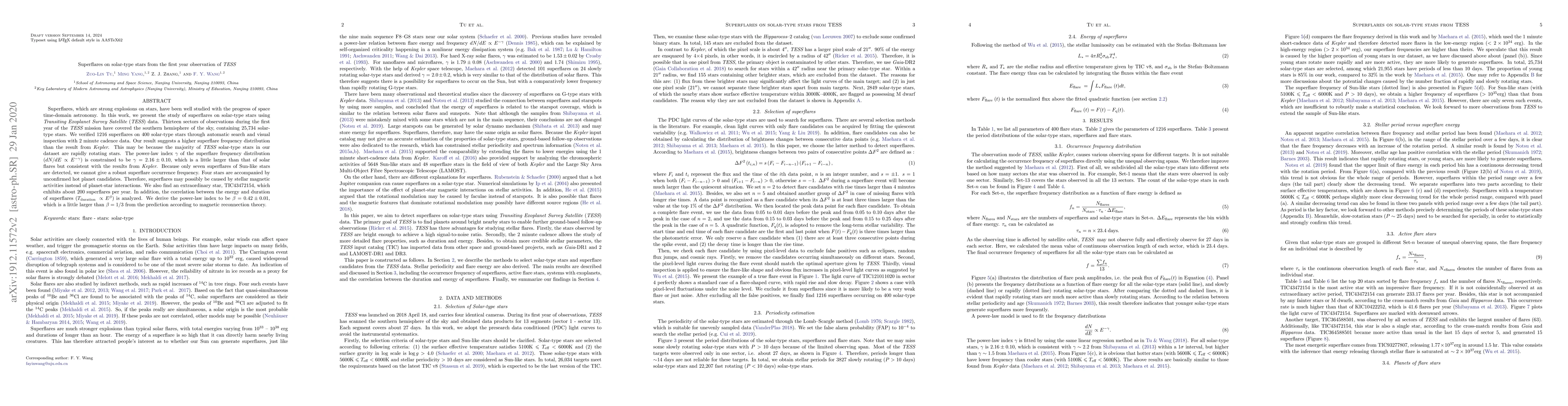 This study analyzes superflares on solar-type stars using TESS data, identifying 1,216 superflares on 400 stars, suggesting a higher frequency than Kepler results. The power-law index for superflare frequency distribution is $\gamma = 2.16\pm 0.10$, indicating stellar magnetic activity as the likely cause rather than planet-star interactions.