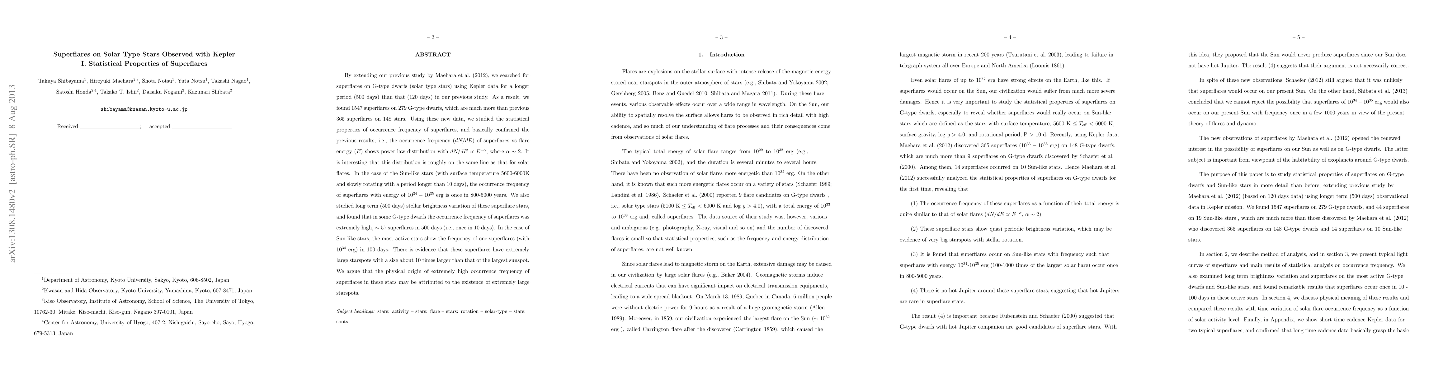 By extending our previous study by Maehara et al. (2012), we searched for superflares on G-type dwarfs (solar type stars) using Kepler data for a longer period (500 days) than that (120 days) in our previous study. As a result, we found 1547 superflares on 279 G-type dwarfs, which are much more than previous 365 superflares on 148 stars. Using these new data, we studied the statistical properties of occurrence frequency of superflares, and basically confirmed the previous results, i.e., the occurrence frequency (dN/dE) of superflares vs flare energy (E) shows power-law distribution with dN/dE \propto E^{-\alpha}, where \alpha ~ 2. It is interesting that this distribution is roughly on the same line as that for solar flares. In the case of the Sun-like stars (with surface temperature 5600-6000K and slowly rotating with a period longer than 10 days), the occurrence frequency of superflares with energy of 10^34 -10^35 erg is once in 800-5000 years. We also studied long term (500 days) stellar brightness variation of these superflare stars, and found that in some G-type dwarfs the occurrence frequency of superflares was extremely high, ~ 57 superflares in 500 days (i.e., once in 10 days). In the case of Sun-like stars, the most active stars show the frequency of one superflares (with 10^34 erg) in 100 days. There is evidence that these superflares have extremely large starspots with a size about 10 times larger than that of the largest sunspot. We argue that the physical origin of extremely high occurrence frequency of superflares in these stars may be attributed to the existence of extremely large starspots.