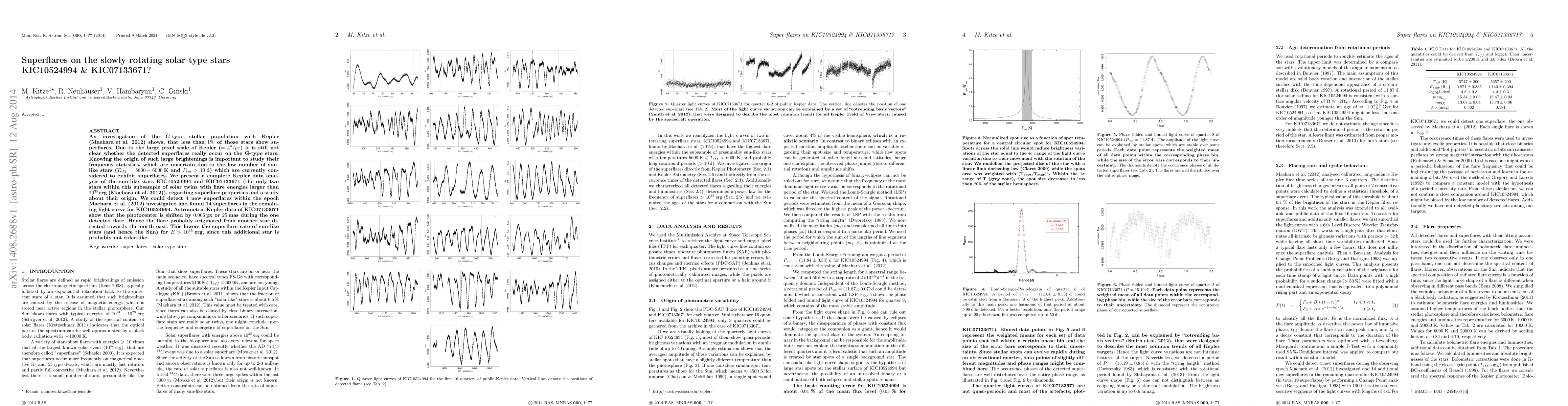 An investigation of the G-type stellar population with Kepler (as done by Maehara et al.) shows that less than 1 per cent of those stars show superflares. Due to the large pixel scale of Kepler ($\sim4 arcsec \: px^{-1}$), it is still not clear whether the detected superflares really occur on the G-type stars. Knowing the origin of such large brightenings is important to study their frequency statistics, which are uncertain due to the low number of sun-like stars ($T_{eff} = 5600-6000 \:K$ and $P_{rot} > 10 \:d$) which are currently considered to exhibit superflares. We present a complete Kepler data analysis of the sun-like stars KIC10524994 and KIC07133671 (the only two stars within this subsample of solar twins with flare energies larger than $10^{35}$ erg; Maehara et al.), regarding superflare properties and a study about their origin. We could detect four new superflares within the epoch Maehara et al. investigated and found 14 superflares in the remaining light curve for KIC10524994. Astrometric Kepler data of KIC07133671 show that the photocentre is shifted by 0.006 px or 25 mas during the one detected flare. Hence, the flare probably originated from another star directed towards the north-east. This lowers the superflare rate of sun-like stars (and hence the Sun) for $E > 10^{35}$ erg, since this additional star is probably not solar-like.
