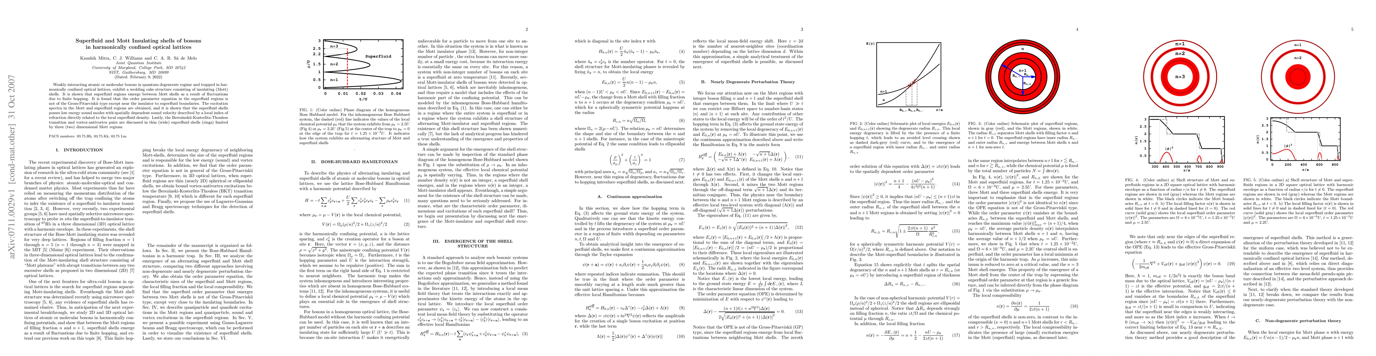 Weakly interacting atomic or molecular bosons in quantum degenerate regime and trapped in harmonically confined optical lattices, exhibit a wedding cake structure consisting of insulating (Mott) shells. It is shown that superfluid regions emerge between Mott shells as a result of fluctuations due to finite hopping. It is found that the order parameter equation in the superfluid regions is not of the Gross-Pitaeviskii type except near the insulator to superfluid boundaries. The excitation spectra in the Mott and superfluid regions are obtained, and it is shown that the superfluid shells posses low energy sound modes with spatially dependent sound velocity described by a local index of refraction directly related to the local superfluid density. Lastly, the Berezinskii-Kosterlitz-Thouless transition and vortex-antivortex pairs are discussed in thin (wide) superfluid shells (rings) limited by three (two) dimensional Mott regions.