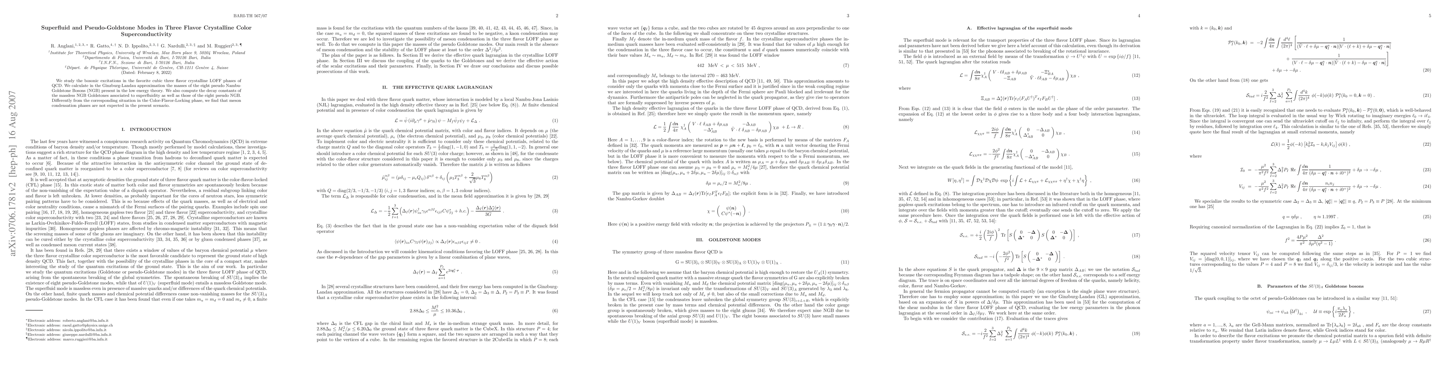 This paper investigates the bosonic excitations in cubic three-flavor crystalline LOFF phases of QCD, calculating the masses of eight pseudo Nambu-Goldstone Bosons and the decay constants of massless Goldstone bosons linked to superfluidity. Unlike in the Color-Flavor-Locking phase, meson condensation phases are not anticipated in this scenario.
