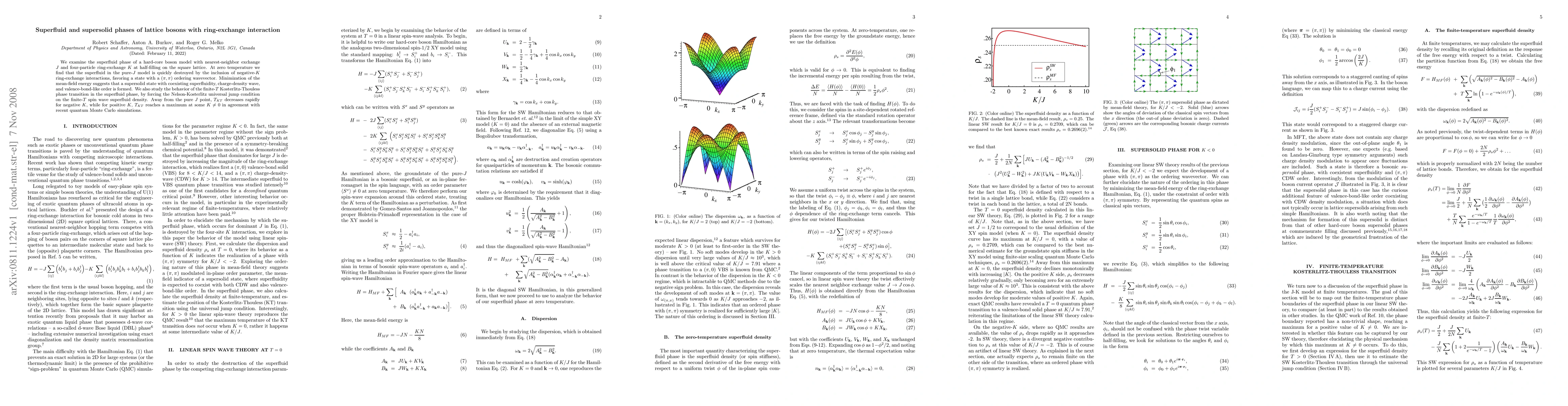 We examine the superfluid phase of a hard-core boson model with nearest-neighbor exchange J and four-particle ring-exchange K at half-filling on the square lattice. At zero temperature we find that the superfluid in the pure-J model is quickly destroyed by the inclusion of negative-K ring-exchange interactions, favoring a state with a (pi,pi) ordering wavevector. Minimization of the mean-field energy suggests that a supersolid state with coexisting superfluidity, charge-density wave, and valence-bond-like order is formed. We also study the behavior of the finite-T Kosterlitz-Thouless phase transition in the superfluid phase, by forcing the Nelson-Kosterlitz universal jump condition on the finite-T spin wave superfluid density. Away from the pure J point, T_{KT} decreases rapidly for negative K, while for positive K, T_{KT} reaches a maximum at some K \neq 0 in agreement with recent quantum Monte Carlo simulations.