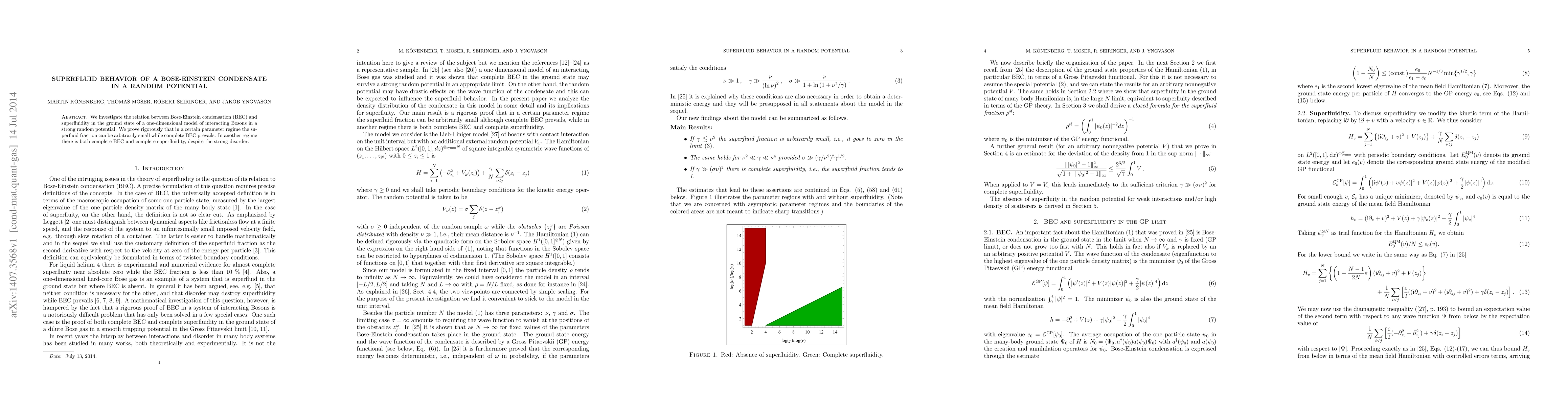 This paper rigorously proves that in a one-dimensional model of interacting Bosons under a strong random potential, superfluidity can coexist with complete Bose-Einstein condensation (BEC) or occur independently, with the superfluid fraction being arbitrarily small even as BEC prevails.