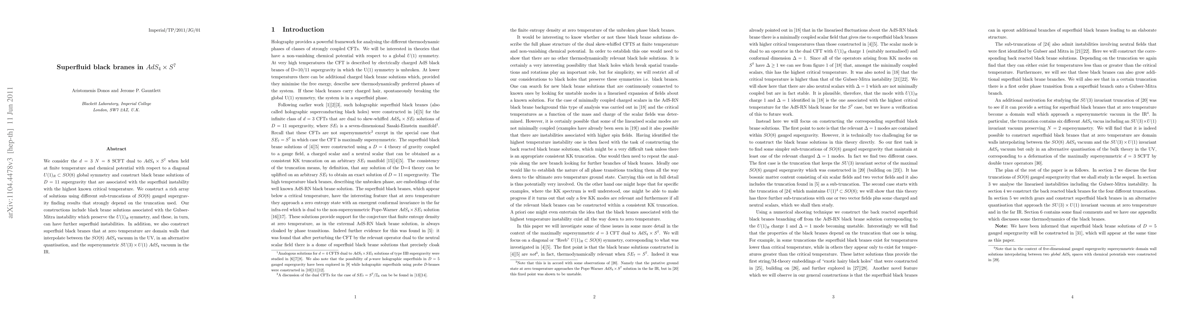 This paper explores the superfluid instabilities in D=11 supergravity dual to a d=3 N=8 SCFT at finite temperature and chemical potential, constructing various black brane solutions with the highest known critical temperature. The study reveals significant dependence on the truncation of the SO(8) symmetry and includes solutions associated with the Gubser-Mitra instability and domain walls interpolating between different vacuum states.